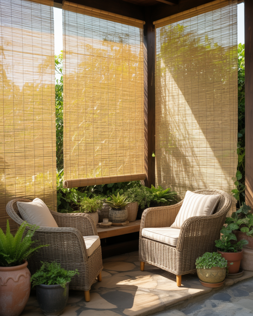 Roll-down bamboo blinds provide both shade and privacy in outdoor areas, functioning almost like privacy screens but with a warm, organic touch. They work brilliantly for front porches and townhouse patios where neighbors are nearby. Their natural finish pairs well with plants, and I’ve admired how they transform harsh light into a calm filtered glow—an affordable upgrade that feels artisanal.