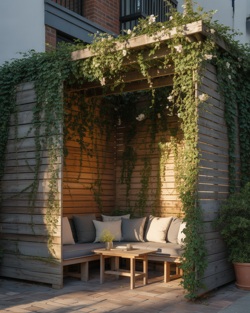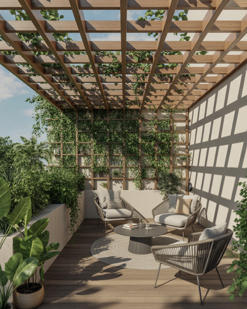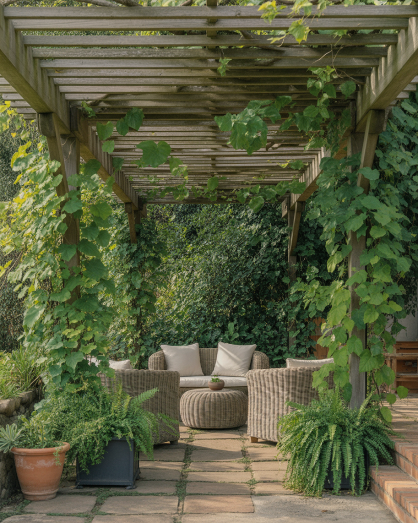 An overhead wooden grid gives vines room to thrive, creating living shade with plants that feels lush and timeless. This works beautifully for apartment terraces, compact front patios, or rental homes where permanent roofs aren’t allowed. I once helped build one for a neighbor, and within a season, greenery transformed the spot into a cool retreat—completely affordable and naturally elegant.