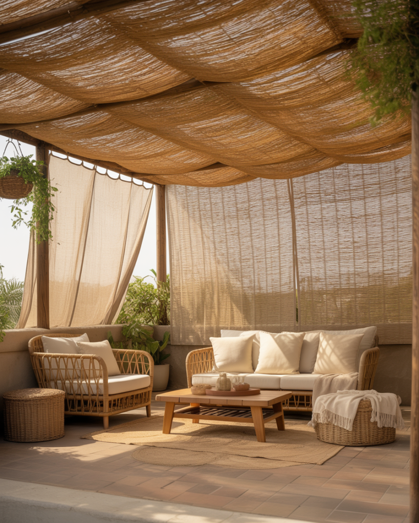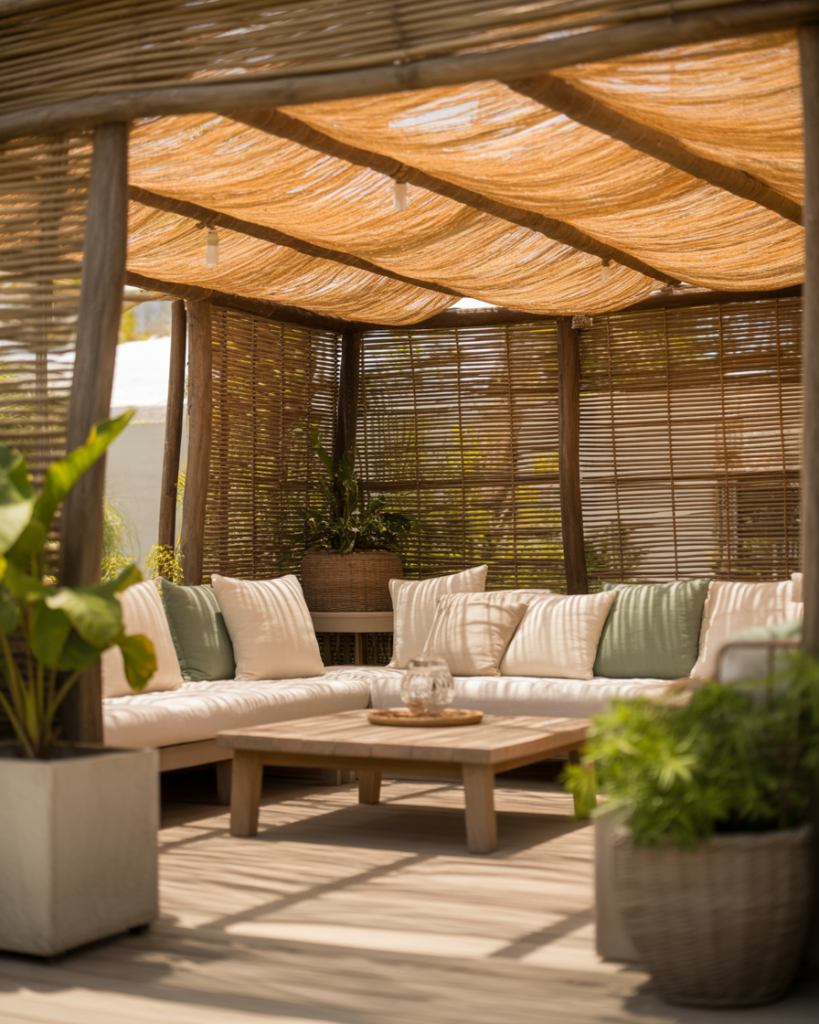 A woven reed canopy brings warmth and texture to outdoor settings, especially in windy areas where lightweight materials behave well. This approach works for backyard porches, front patios, or apartment balconies seeking a relaxed coastal feel. I once sat under one during a summer gathering, and the filtered light gave the whole space a mellow, vacation-like tone while staying affordable.