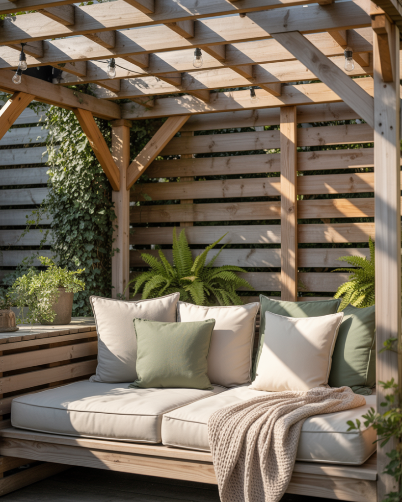 A low pergola built over a daybed creates a small, intimate retreat that feels luxurious while staying budget-friendly. It works beautifully for backyard lounging, apartment terraces, or a quiet corner meant for napping. Add lightweight curtains or vines with plants for extra comfort. A neighbor built one last year, and it became the most popular nap spot during summer.