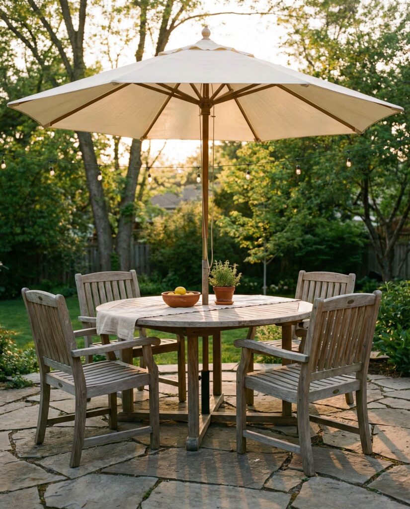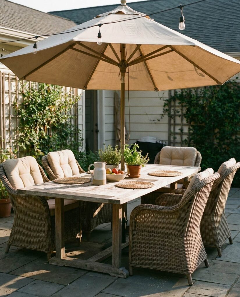Umbrella-ready patio tables combine comfort and smart design. I’ve found these tables essential during hot afternoons, making outdoor meals more enjoyable. In patio tables ideas outdoor, built-in umbrella slots preserve space and balance. Thoughtful decor ideas keep the table functional without crowding. Paired with supportive chairs, this setup supports daily use and seasonal entertaining with ease.