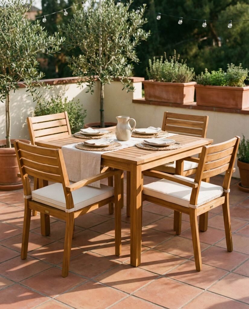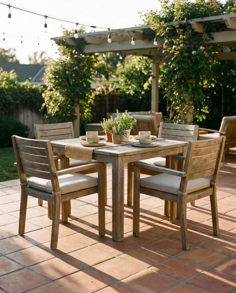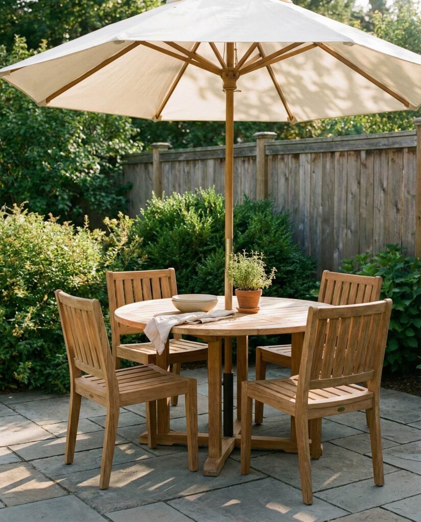 A Round Wood patio tables concept remains a favorite because it naturally encourages conversation and relaxed setting ideas. I’ve noticed friends linger longer around round tables, especially when paired with comfortable chairs and an Umbrella for shade. In patio tables ideas outdoor, wood brings warmth that works with both modern and Farmhouse aesthetics. These tables often become the Centerpiece outdoor zones for casual dinners or morning coffee. Adding subtle decor ideas like linen runners or simple decorations keeps the setting flexible. Designers frequently recommend sealed oak or teak for longevity, balancing natural texture with modern design sensibilities.