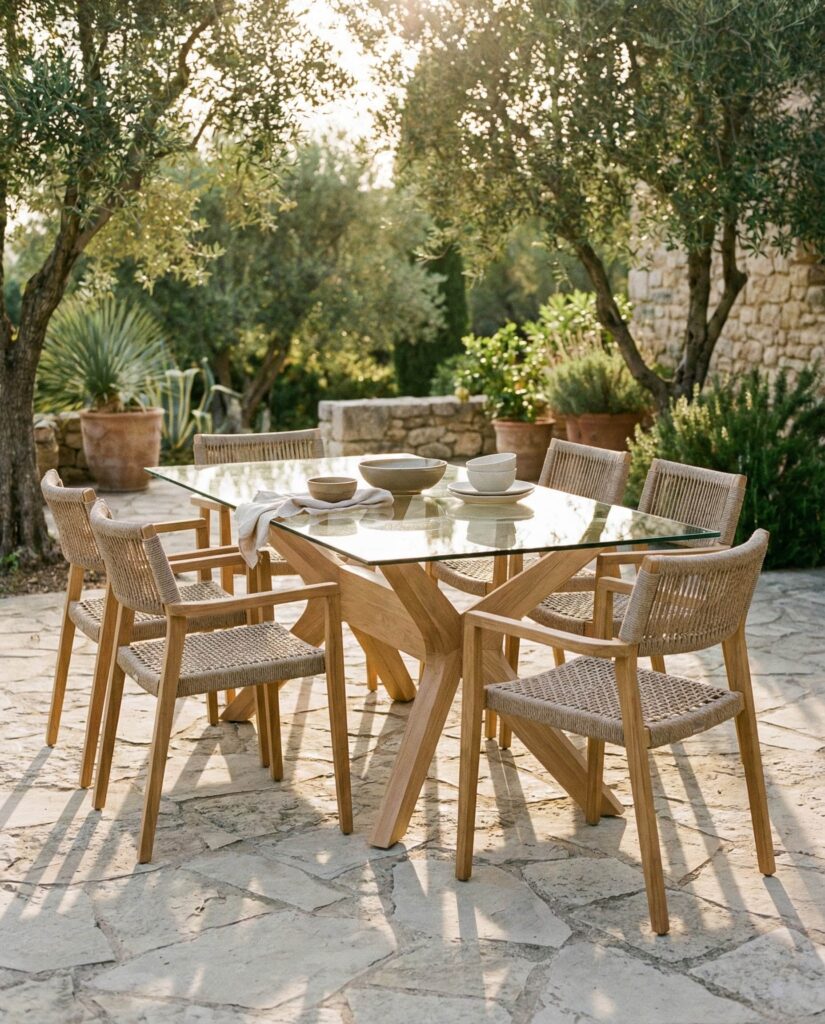 Combining Glass and Wood in patio tables creates a balanced look that feels both modern and grounded. I’ve seen this mix work beautifully in transitional homes where indoor and Outdoor styles blend. In patio tables ideas outdoor, glass tops keep the space visually open, while wood bases add warmth and structure. Paired with simple chairs, this setup allows flexible decor ideas without overwhelming the setting. Designers often recommend this combination for homeowners seeking lightness without sacrificing character, making it ideal for relaxed yet polished styling.