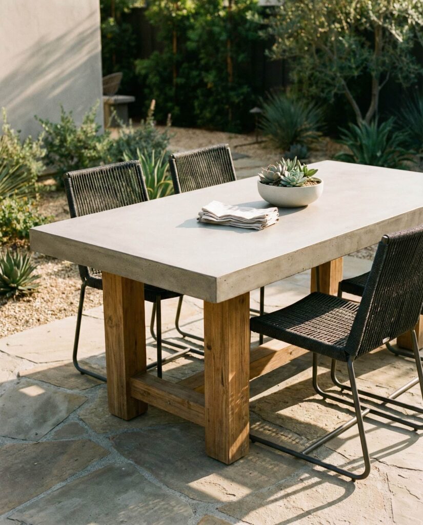 14. Concrete and Wood Hybrid Tables for Modern Yards