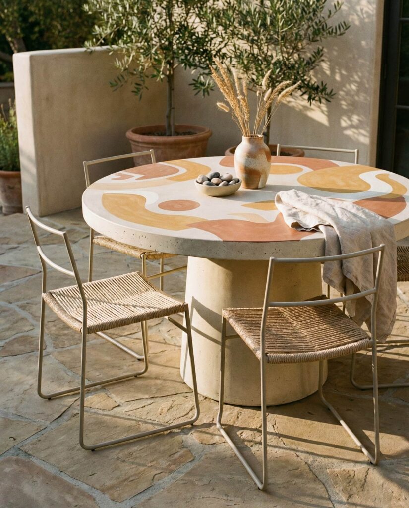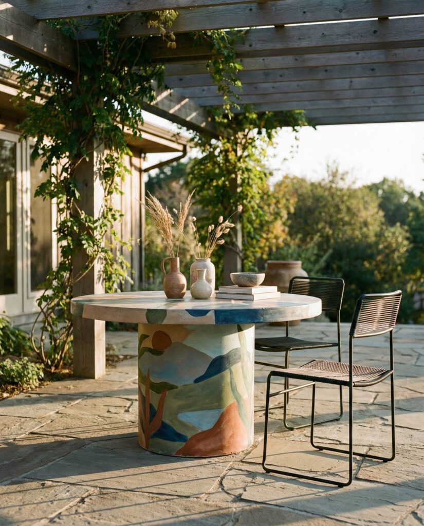 A Painted Concrete Makeover offers a bold way to personalize outdoor furniture. I’ve seen plain concrete tables transformed with soft tones or graphic patterns, elevating the entire Outdoor area. In patio tables ideas outdoor, painted concrete becomes a focal design element. Neutral chairs and restrained decor ideas keep the look intentional. Many designers recommend sealing painted surfaces properly to maintain durability while allowing creative expression within the setting.