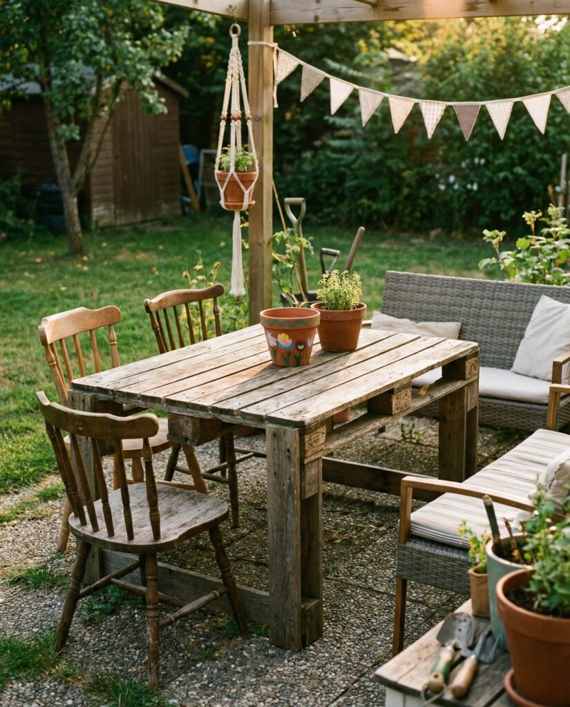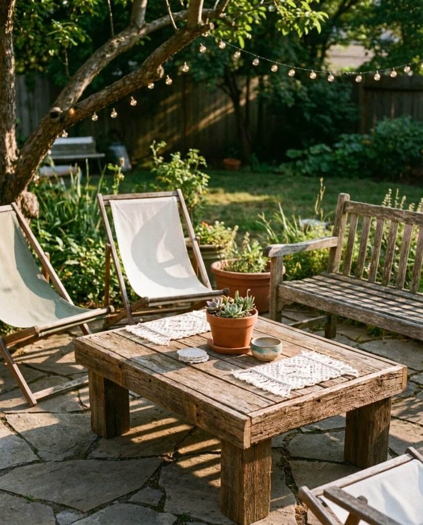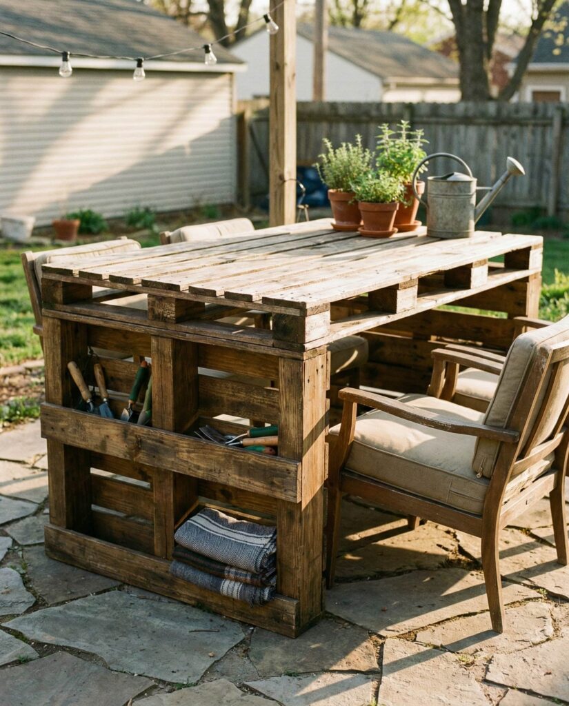 A Pallet Diy patio tables idea with built-in storage suits practical homeowners. I’ve seen pallets stacked cleverly to hold cushions or outdoor tools beneath the Top. In patio tables ideas outdoor, this approach blends function with casual design. Paired with relaxed chairs, it supports informal Outdoor living. Many decor ideas focus on keeping finishes natural, emphasizing texture while maintaining an uncluttered setting.