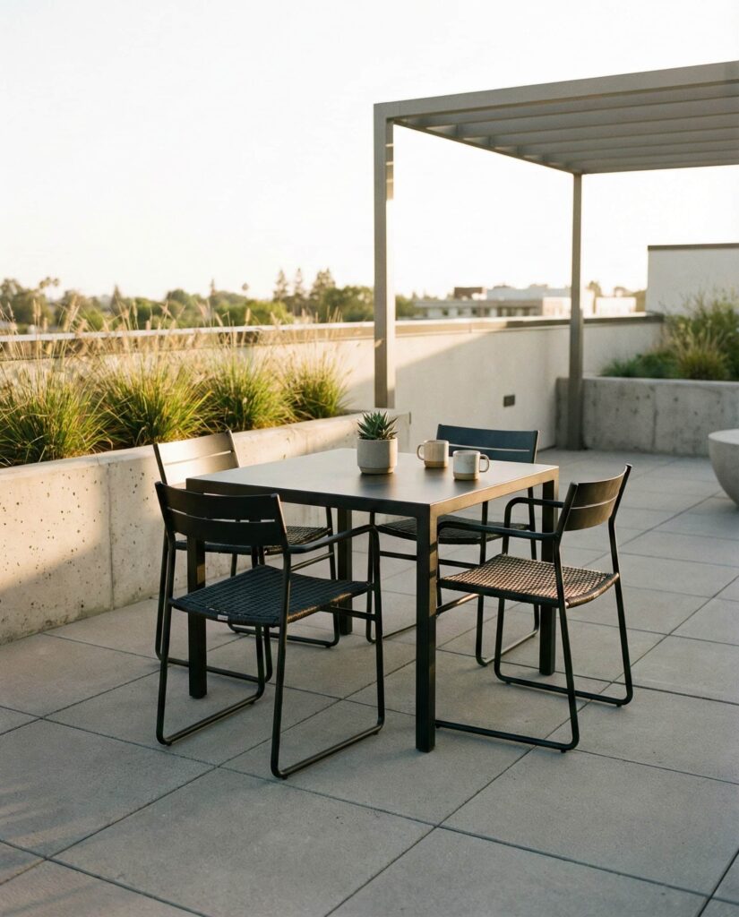 A Concrete and Wood hybrid patio tables concept reflects current architectural trends favoring contrast. I first noticed this style gaining popularity in urban backyards where durability matters. In patio tables ideas outdoor, concrete tops paired with wood legs soften the industrial feel. Neutral decor and supportive chairs complete the look without distraction. Experts often highlight these tables for their stability and longevity, especially in exposed Outdoor conditions. Thoughtful decorating ideas like natural textiles help maintain a warm, livable setting.