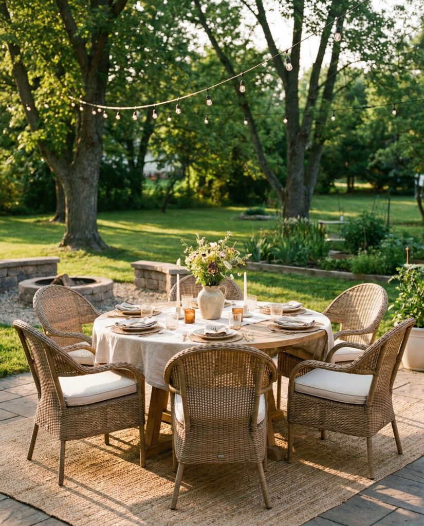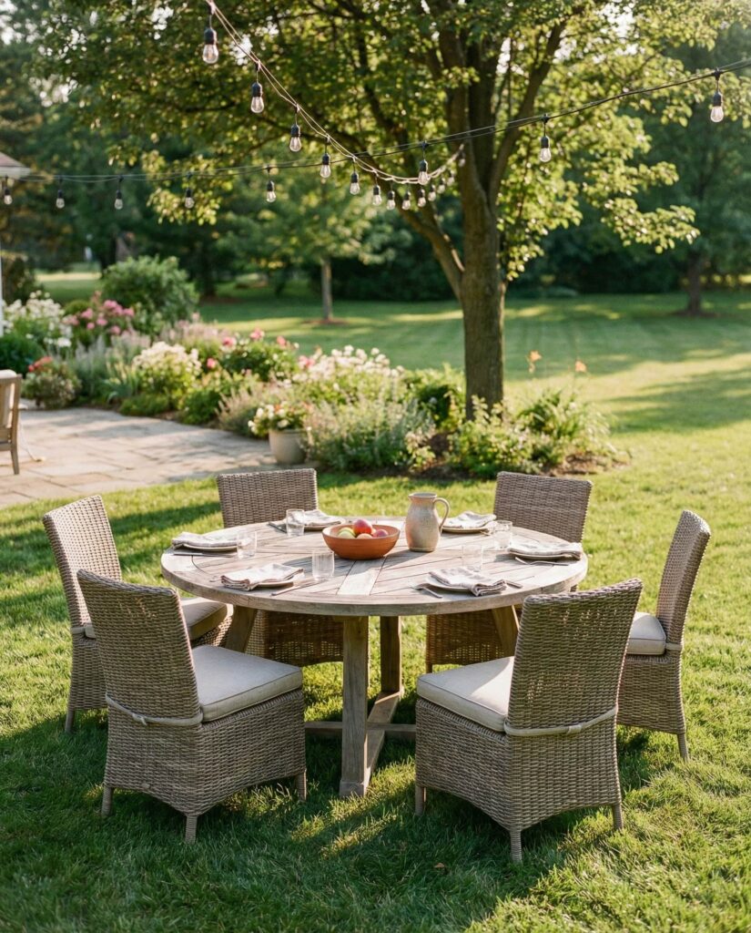 Using Round patio tables as a Centerpiece outdoor element creates a natural gathering point. I’ve seen this work especially well in open yards where the table anchors the layout. In patio tables ideas outdoor, round shapes soften landscaping lines and encourage flexible setting ideas. Coordinated chairs and subtle decor maintain flow. Designers often recommend round tables for social Outdoor spaces where movement and conversation are equally important.