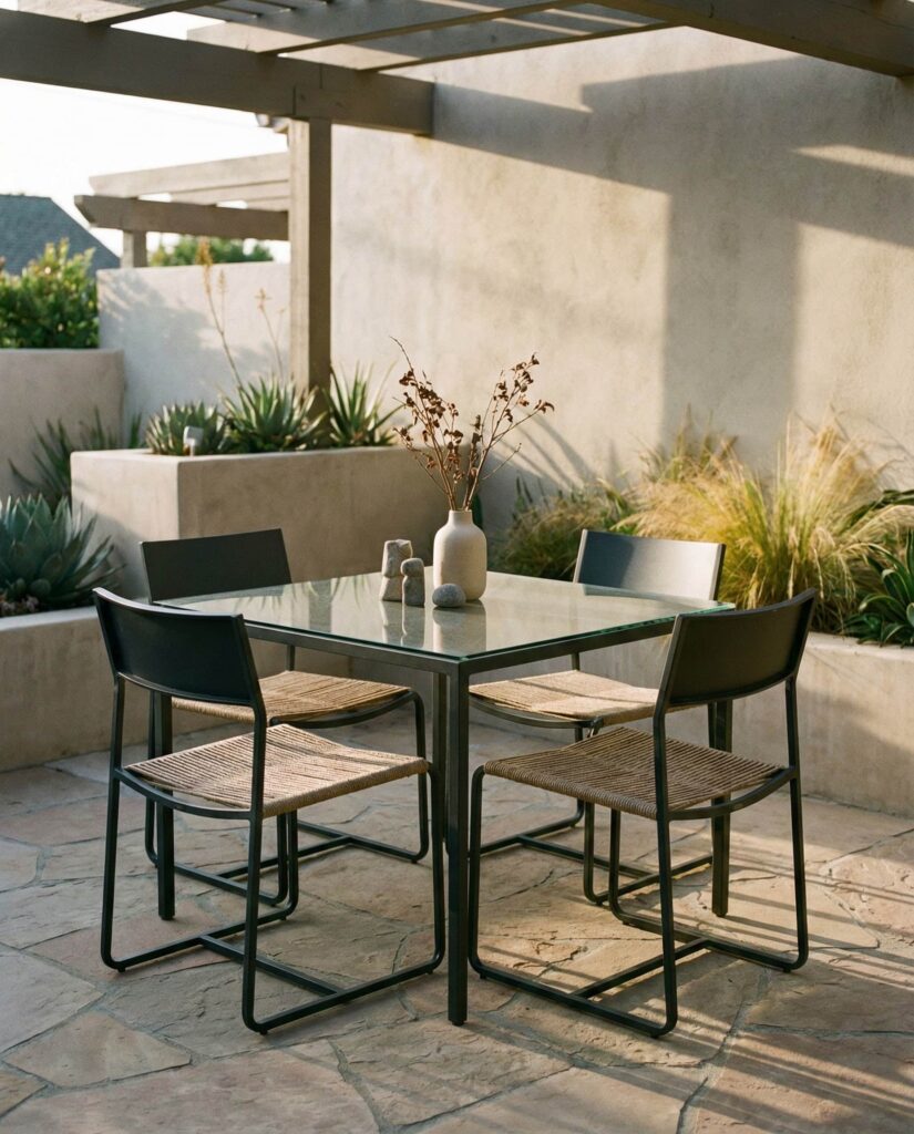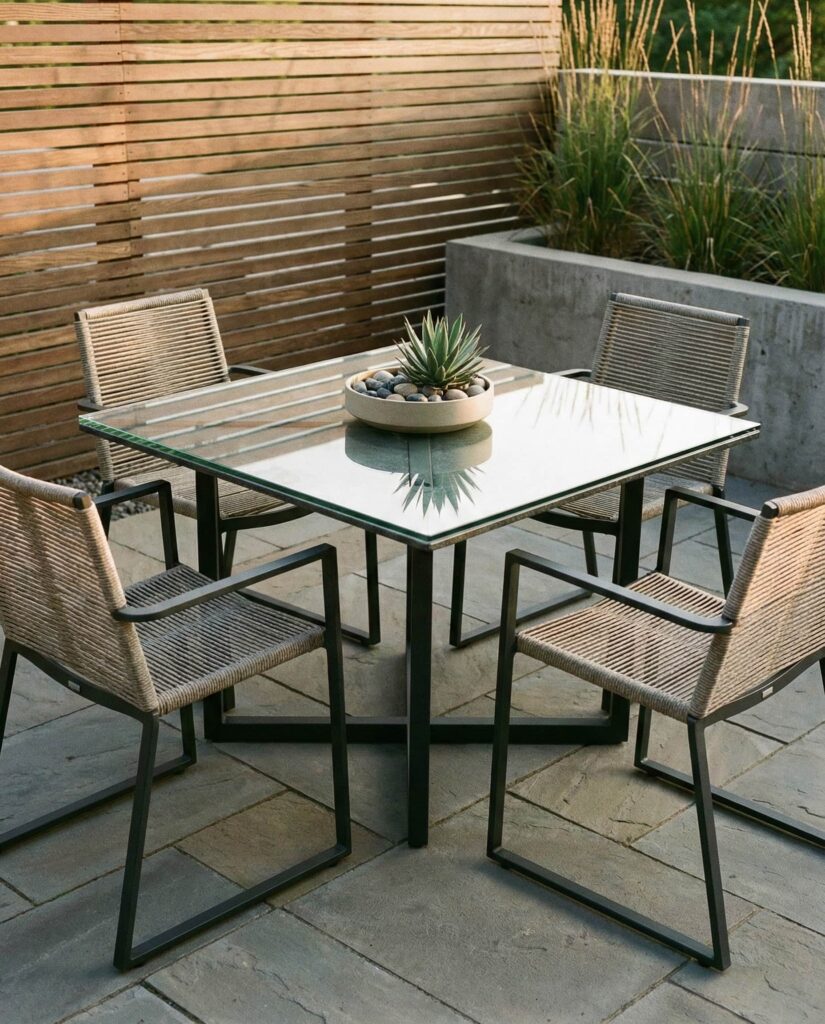 A Square Glass patio tables concept fits perfectly into contemporary Outdoor layouts where clean lines dominate. I’ve noticed these tables are often chosen by homeowners who want subtle elegance without visual heaviness. In patio tables ideas outdoor, glass tops reflect light beautifully, enhancing small patios and defined spaces. Neutral chairs and restrained decor keep the design cohesive. Designers recommend textured placemats or woven elements as decorating ideas to balance the smooth surface. This approach supports refined styling while remaining practical for everyday setting needs.