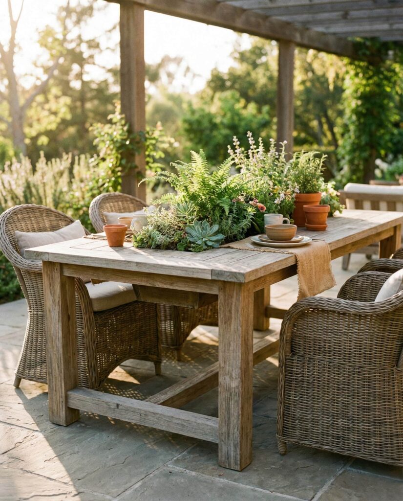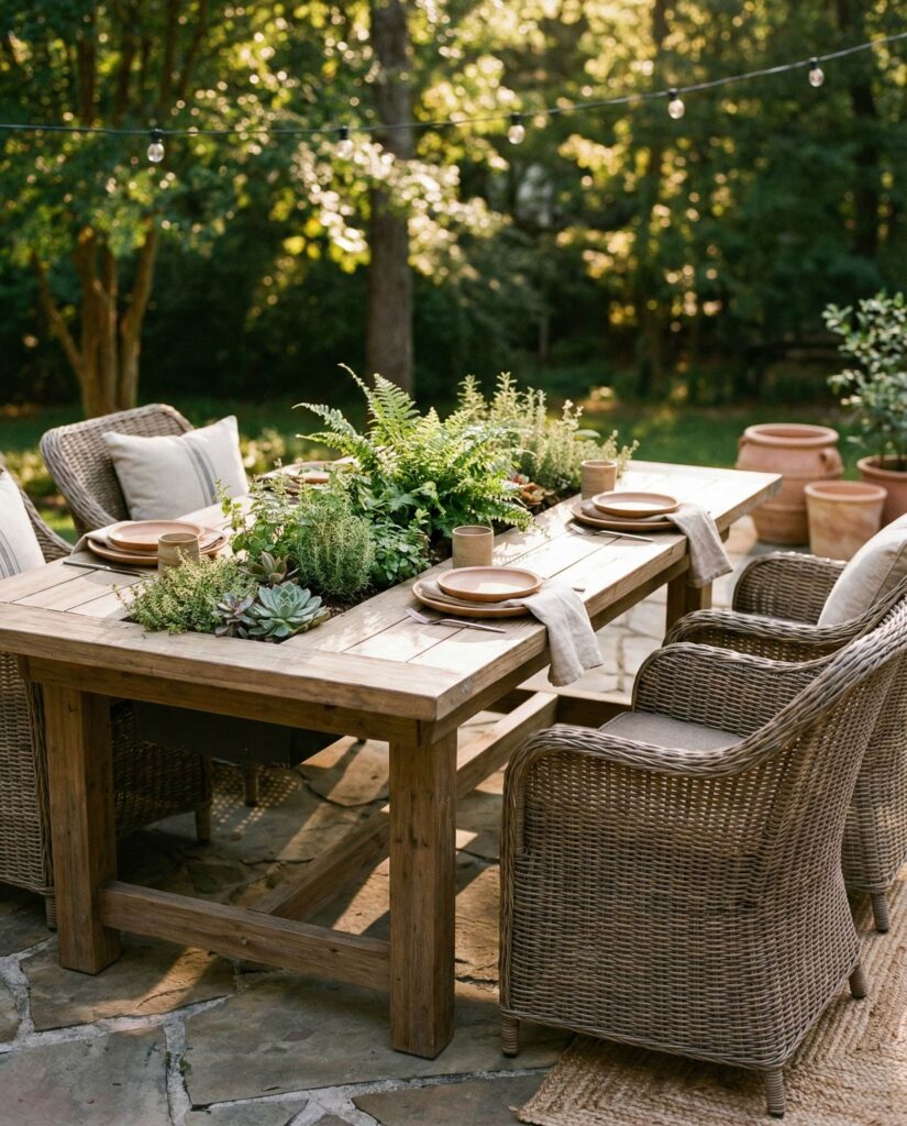 Wood patio tables featuring built-in planter sections redefine the idea of a Centerpiece outdoor feature. I’ve seen these tables instantly elevate patios by blending furniture and nature seamlessly. In patio tables ideas outdoor, integrated greenery replaces traditional decorations, reducing clutter while enhancing atmosphere. Paired with comfortable chairs, this setup feels intentional and calming. Designers often praise this idea for encouraging biophilic design and low-maintenance decor ideas. It’s a smart solution for homeowners who want natural styling woven directly into their Outdoor dining setting.
