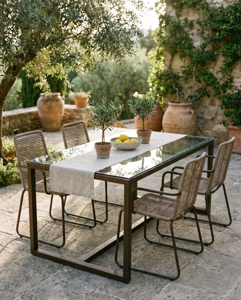 Pairing Wrought iron with Glass creates elegant patio tables that feel light yet detailed. I’ve often noticed these tables in traditional homes updated with modern touches. In patio tables ideas outdoor, glass softens the ornate iron base, while classic chairs maintain continuity. Minimal decorating ideas allow craftsmanship to stand out. Designers appreciate this style for its adaptability across formal and casual Outdoor settings, making it a versatile choice.