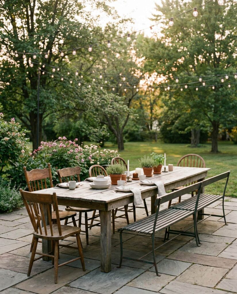 A Long Farmhouse patio tables setup is ideal for large families and gatherings. I’ve noticed these tables naturally invite shared meals and lingering conversations. In patio tables ideas outdoor, farmhouse styles often use reclaimed Wood and sturdy design. Simple decorating ideas, like runners or lanterns, enhance the communal feel without excess. Paired with mixed chairs, this table becomes a welcoming Centerpiece outdoor for celebrations and everyday use.
