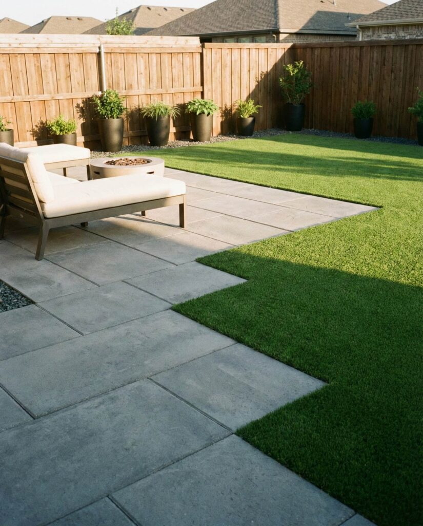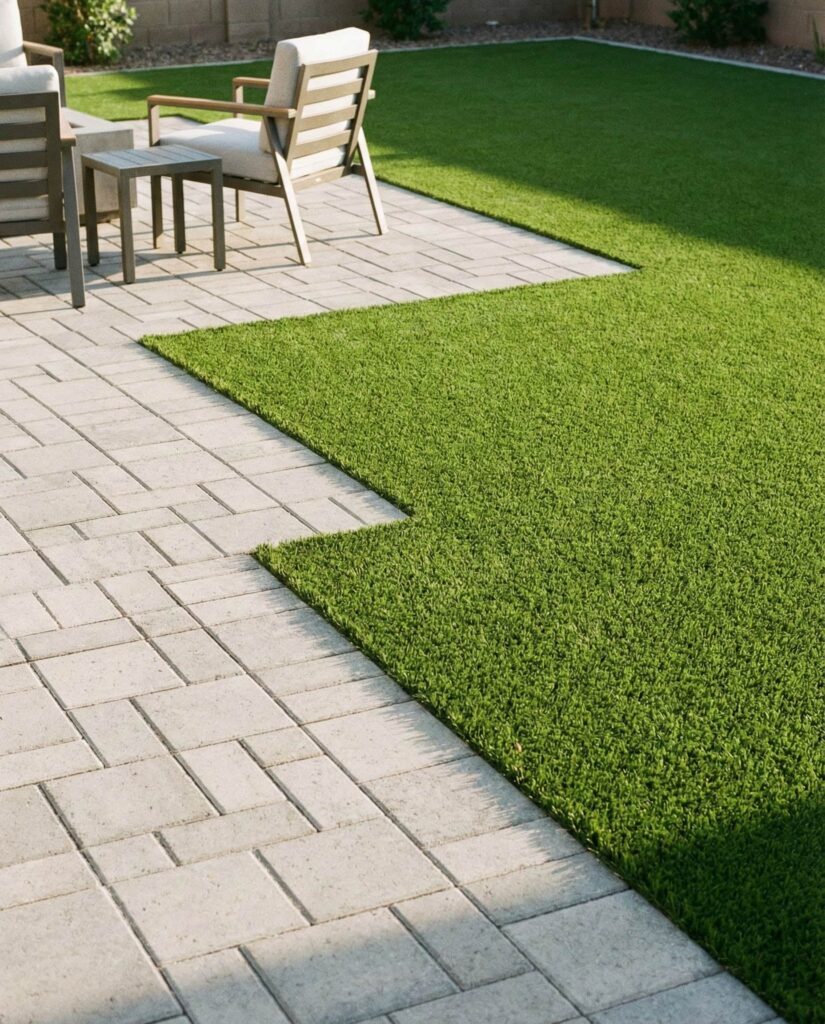 Blending hardscape with green surfaces is increasingly popular, especially paver patios with artificial turf acting as a soft extension of living space. This combination works beautifully for families seeking low maintenance without sacrificing comfort. I’ve noticed how turf areas naturally invite barefoot use, making them ideal near seating or play zones. Designers often recommend this solution for ideas diy projects because installation can be phased. When used near decks, these ideas layout solutions visually connect indoor and outdoor living while keeping upkeep simple, a balance frequently praised by modern landscape editors.