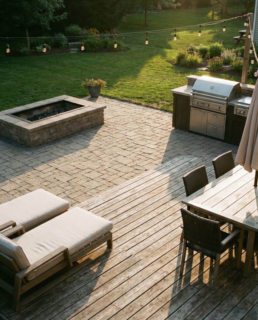 Creating ideas next to deck installations allows patios to act as a natural extension of indoor living. These design ideas are popular among homeowners who entertain frequently, as they offer flexible seating and dining zones beyond the deck itself. I’ve noticed how designers at Better Homes & Gardens emphasize matching tones between deck boards and pavers for visual continuity. When done well, the patio doesn’t compete with the deck but supports it, making the entire Outdoor area feel larger and more intentional.