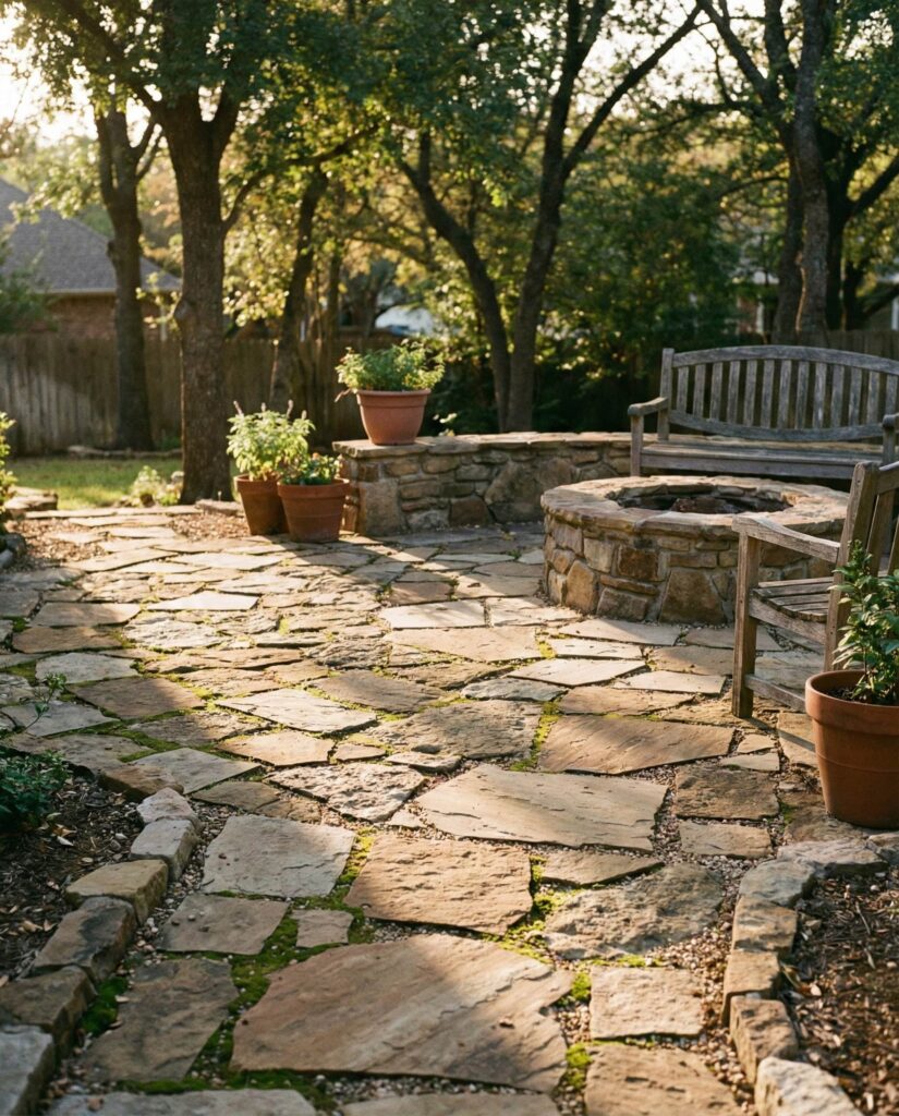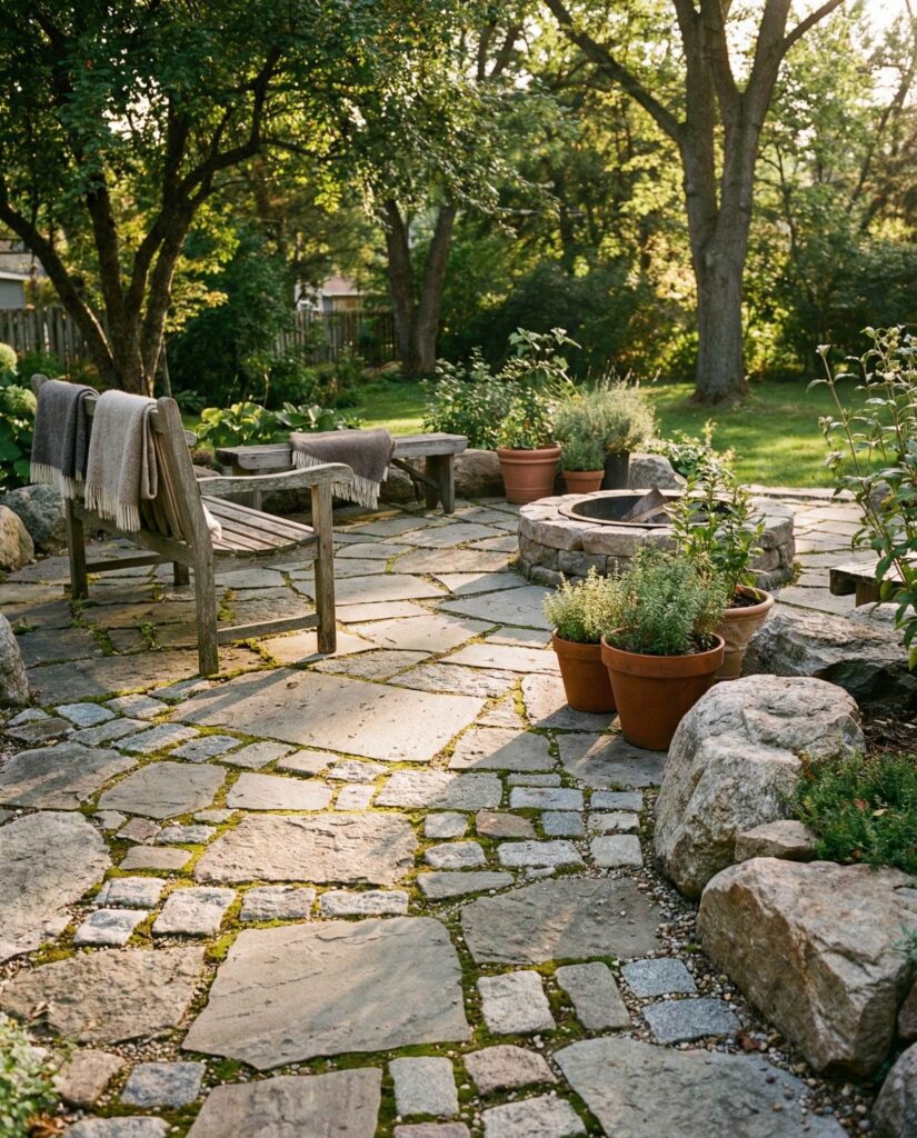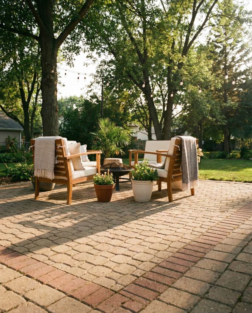 The Rustic look remains strong, especially when Rock and stone textures are layered thoughtfully. These paver patios often use Mixed finishes to create depth, pairing rough stone with smoother pavers. I’ve walked through yards where this approach instantly made the space feel established, even when newly installed. Designers at Country Living emphasize how rustic patios suit both rural and suburban settings, grounding the Outdoor space emotionally. Adding wood furniture or simple planters enhances the authenticity without over-styling, proving that restraint is key in rustic designs.