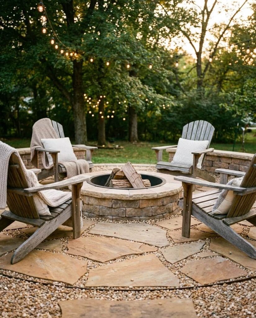 A Circle layout built around a Fire pit remains one of the most emotionally resonant paver patios you can create. The Outdoor experience here is less about movement and more about gathering, something I’ve noticed whenever neighbors naturally pull chairs closer as the evening cools. Circular Paving stones pea gravel borders soften the structure, while solid pavers provide stability underfoot. These design ideas work beautifully in open backyard spaces where the fire pit becomes a visual and social anchor. Publications like Better Homes & Gardens often note how round layouts encourage conversation, and in practice, they feel intuitive rather than styled. This is one of those ideas diy homeowners tackle over a few weekends, creating something deeply personal yet universally inviting.