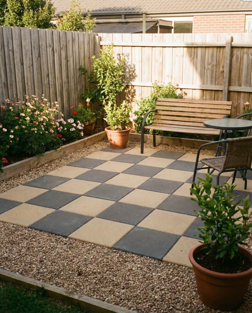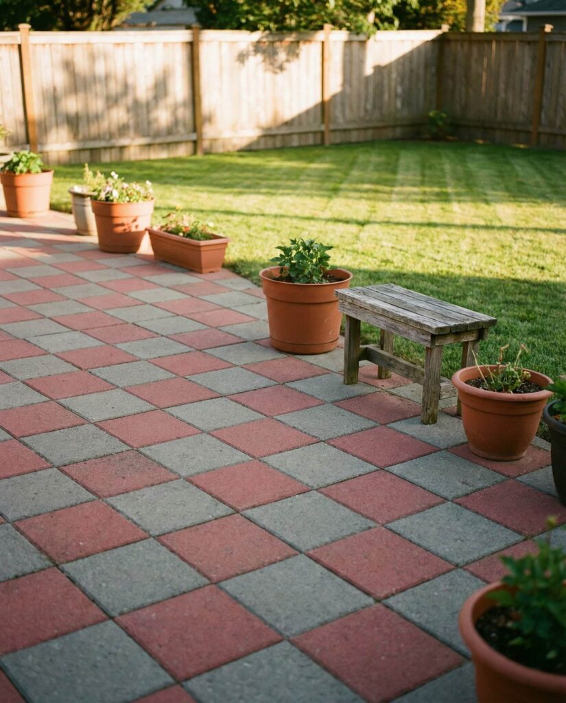Simple Checkered layouts using two complementary tones remain popular ideas diy for beginners. The repeating pattern helps mask small alignment errors, something many DIY homeowners appreciate. I’ve noticed renovation bloggers often suggest this style as a confidence builder. These paver patios work well in compact backyard settings where bold patterns add interest without requiring complex cuts, making them approachable and visually rewarding.