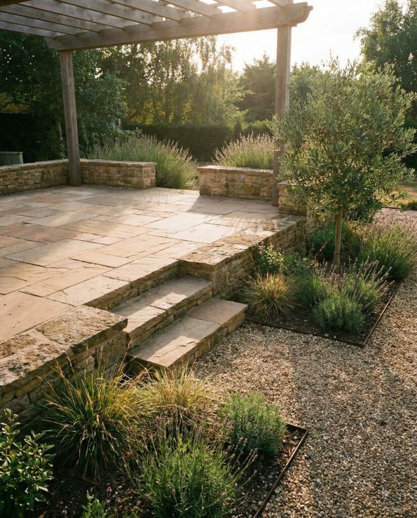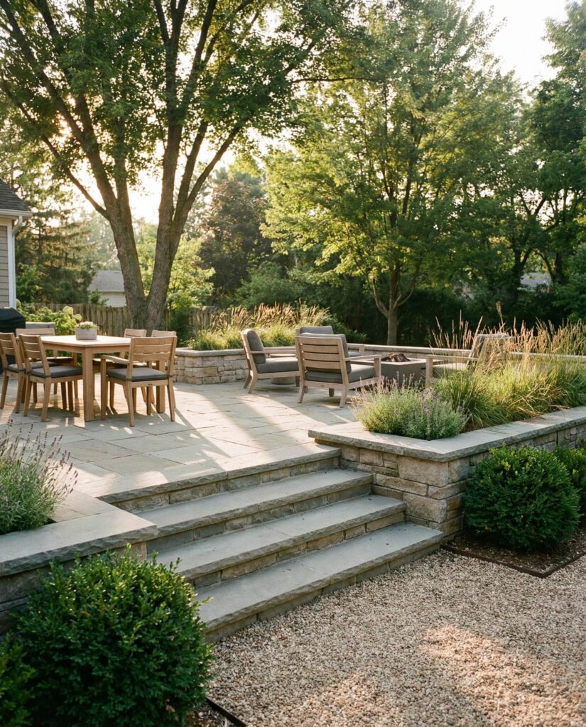 A Raised paver patio introduces gentle elevation that helps define purpose without walls or railings. In many suburban backyard projects, this approach solves drainage issues while visually separating dining and lounging zones. Using Gravel and stone edging beneath the raised platform adds both stability and rustic texture. These design ideas often appear in expert breakdowns on Houzz because they balance form and function so well. I’ve walked on patios like this where the elevation is barely noticeable, yet the space feels intentional and finished. When paired with clean Stairs, the transition feels architectural rather than improvised, making this one of those ideas layout solutions that quietly elevates everyday outdoor living.