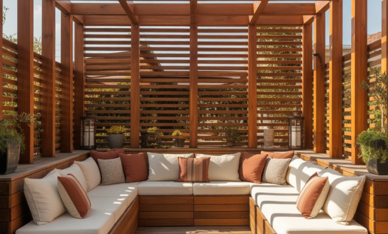 Using slatted wood or metal screens, this pergola design adds privacy while keeping airflow, making it excellent in elevation patios or compact yards. It merges function with aesthetics, giving homeowners a refuge from neighbors without feeling closed in. The result is a versatile space comfortable for reading, dining, or unwinding.
