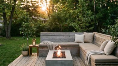 Integrating benches or wraparound seating into a wooden frame creates a functional layout ideal for families and social gatherings. This concept works beautifully for terrace or small patio areas where smart space use matters. Cozy and efficient, it becomes a natural gathering spot for conversations and relaxation.