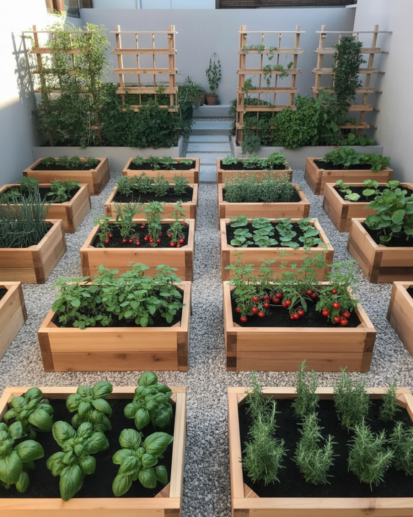 Raised planters arranged in a grid offer excellent design ideas for people gardening on a budget. These boxes keep a garden organized, improve soil conditions, and make harvesting easier. A friend with little space used a series of narrow boxes to grow veggies for her kids, maintaining both order and beauty while keeping pathways clear.