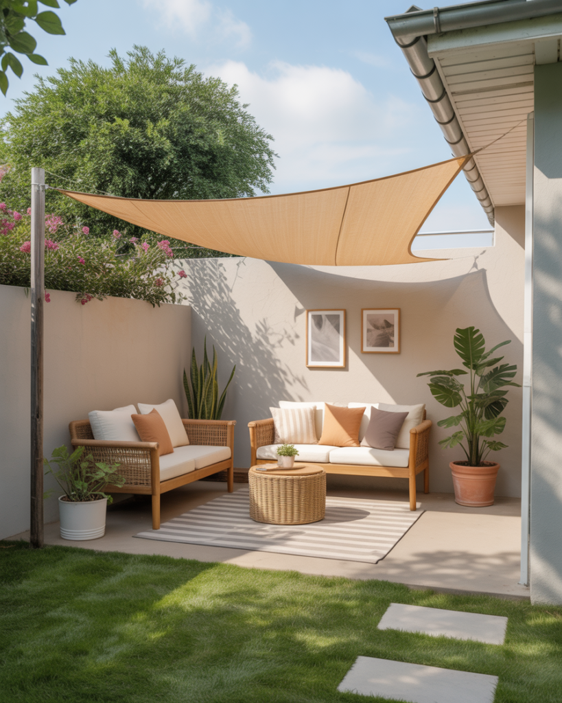 A shade sail instantly creates a comfortable micro-lounge using Simple, modern designs, and Ideas on a budget. It’s perfect for reading, napping, or cooling down in summer. I’ve seen families pair a triangular sail with a rug and cushions to make a surprisingly elegant outdoor retreat protected from sun and suitable even for kids or dogs.