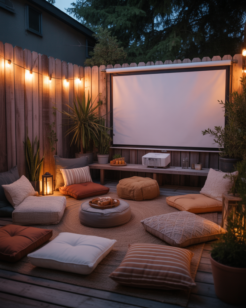 A simple projection wall offers big enjoyment on a budget using smart design ideas and compact plans. A white panel or retractable screen paired with floor cushions turns a tiny backyard into a private cinema. A family I know hosts weekly movie nights without needing a large yard—just creativity and cozy seating.