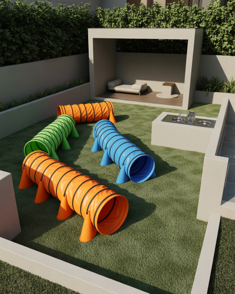 Pet lovers can create playful areas for dogs without taking over the whole yard. Using turf, tunnels, and shaded hideouts supports both fun and tidy layout principles. I saw a dachshund owner build a tiny tunnel maze, making her small yard both adorable and functional while keeping dogs active.