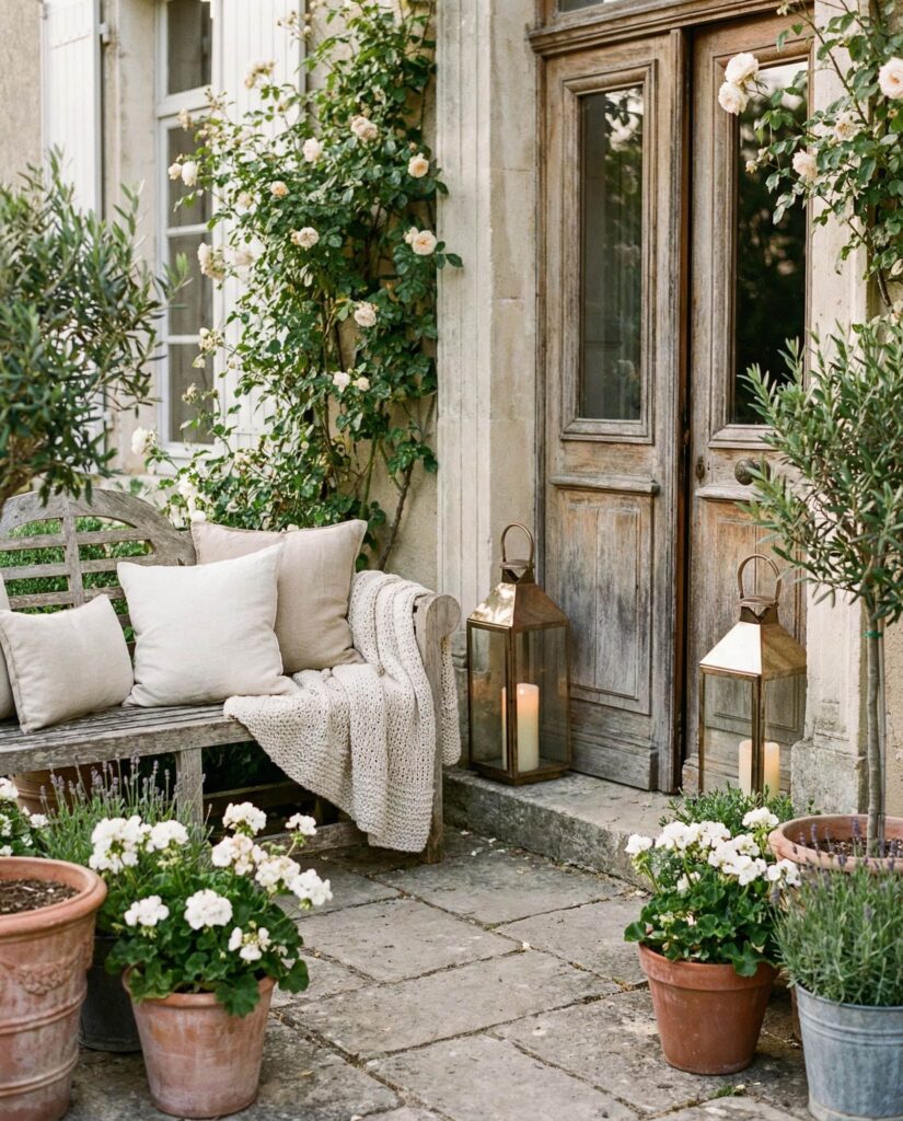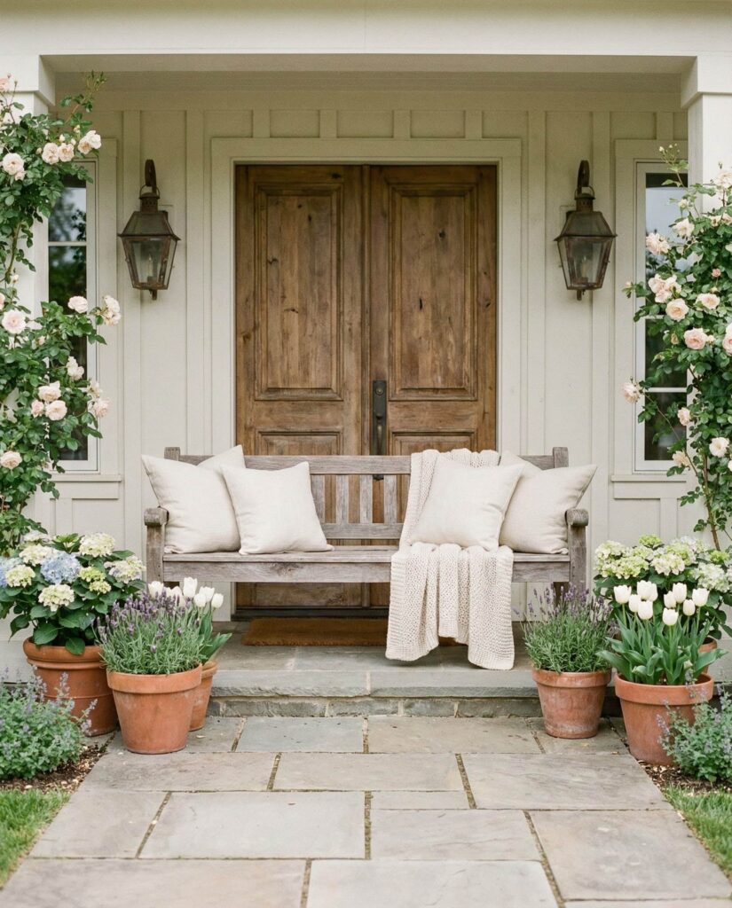 This approach blends Farmhouse style french country charm with relaxed Farmhouse style comfort, making it ideal for a welcoming front entry. Think soft textures, wooden benches, weathered urns, and muted florals that transition well from winter to spring. These Outdoor decorations springtime work beautifully for double doors, adding symmetry without stiffness. I’ve seen neighbors slowly build this look over seasons, often sourcing lanterns from Amazon and repurposing family pieces. The result feels elegant yet approachable, a style that looks intentional but never overdone, perfect for homes that want character without fuss.