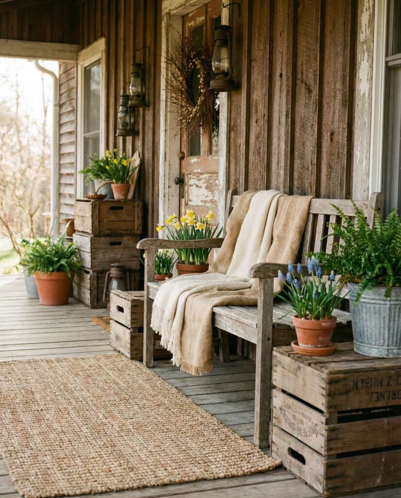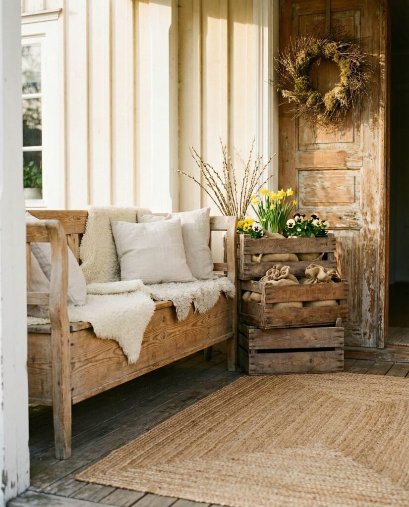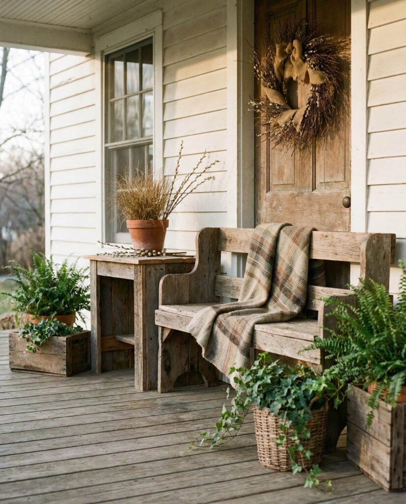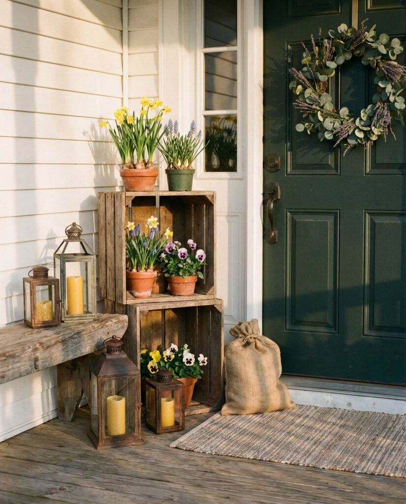 This idea focuses on Wooden textures layered thoughtfully to bridge winter to spring without a hard seasonal break. Rough benches, aged stools, and stacked Crates work as flexible Outdoor decorations that can evolve from late winter early days into warmer afternoons. The look feels grounded and familiar, ideal for a casual front entry that doesn’t rely on florals alone. I’ve seen this style work especially well in suburban homes where homeowners prefer natural materials over trends. By keeping tones neutral and finishes imperfect, the porch feels authentic, relaxed, and quietly inviting rather than staged or overly themed.