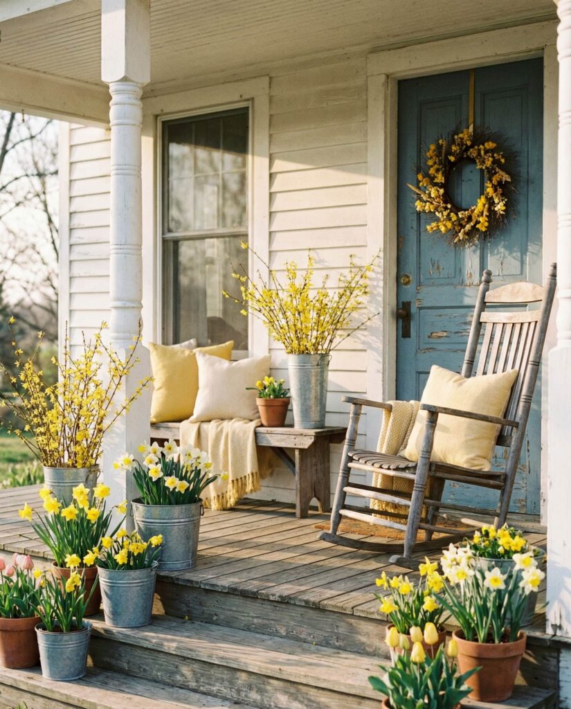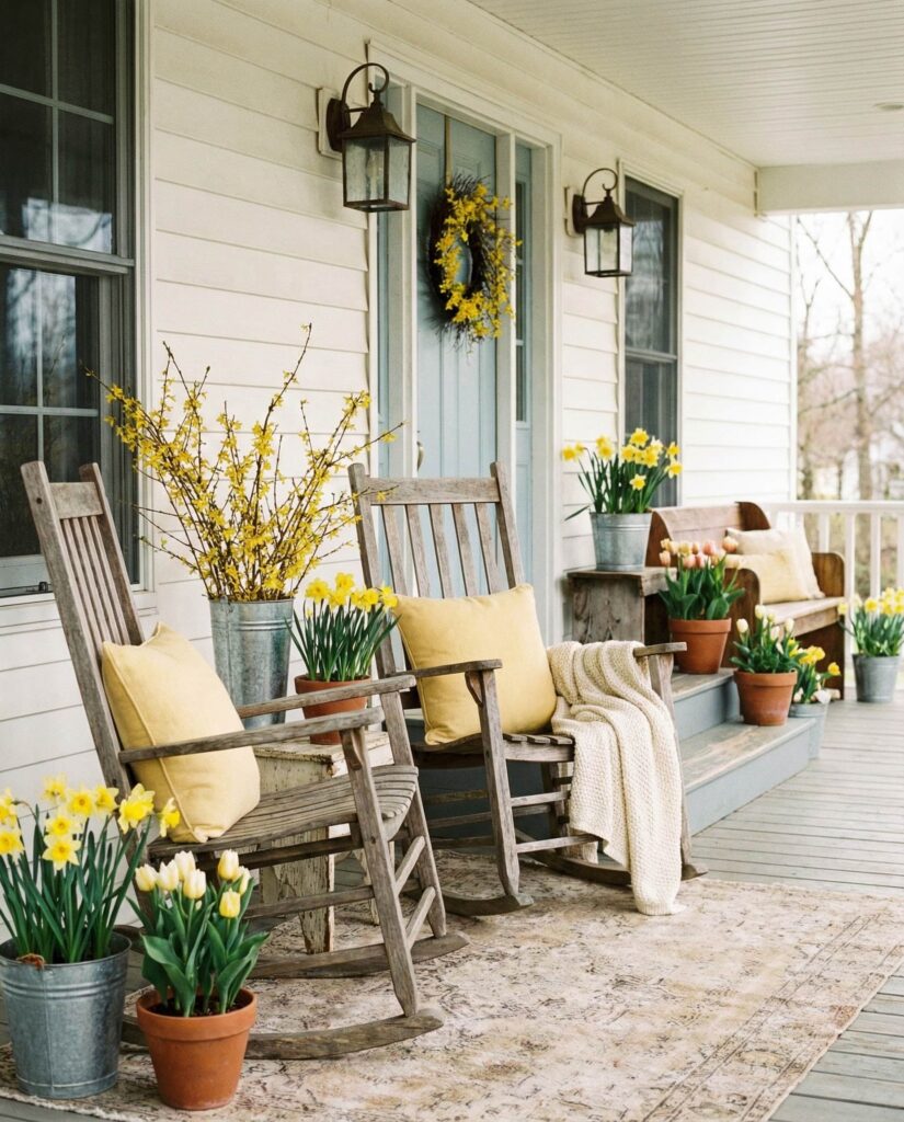 Incorporating Yellow is one of the simplest Ideas for brightening a porch during late winter early spring. Used sparingly through pillows, florals, or wreaths, it adds warmth without overpowering the space. This Elegant approach works across styles, from traditional to modern. I’ve often seen how just one pop of color can lift an entire exterior, especially after months of gray weather. It’s a small change with a big emotional payoff.