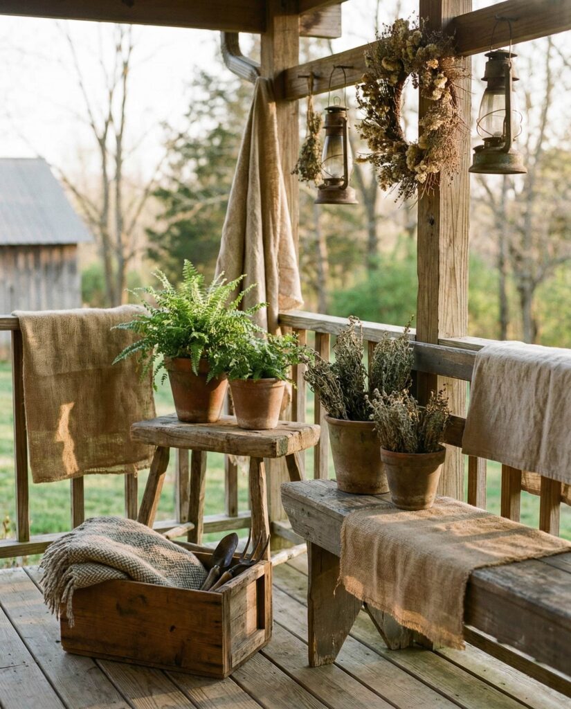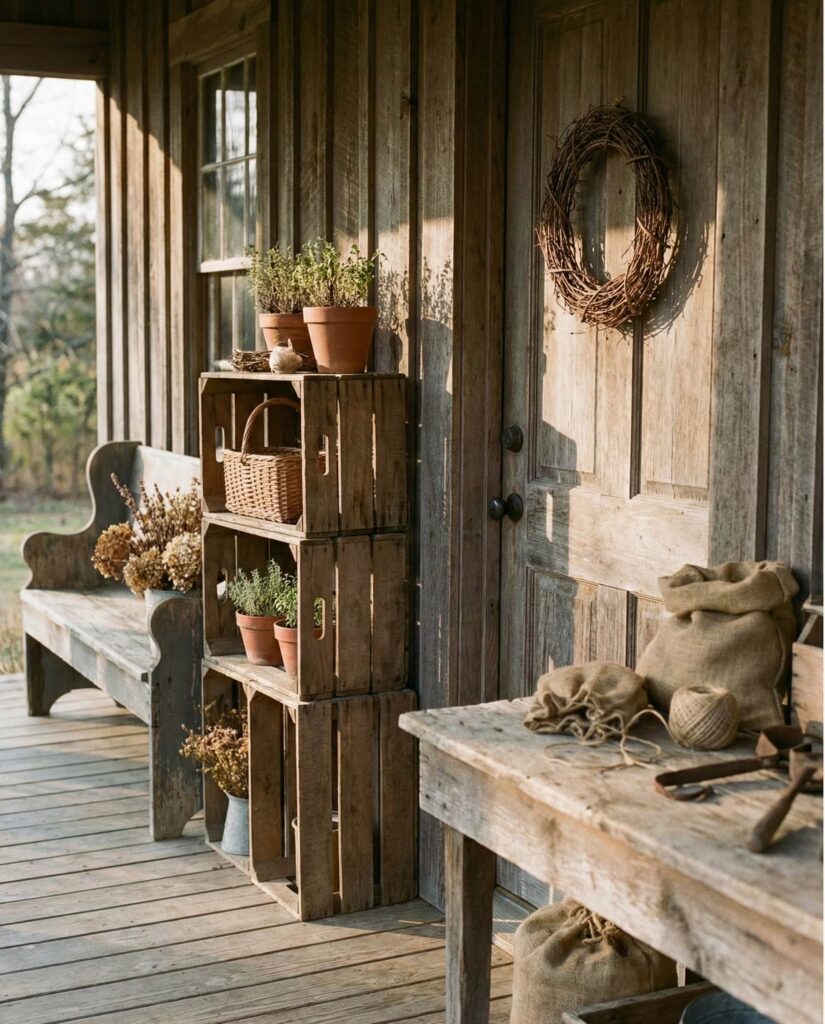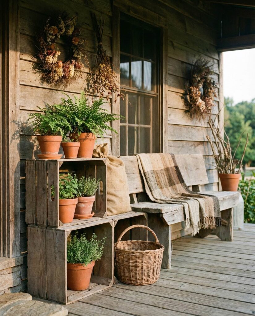 Using Crates creatively is an Easy diy solution for porches with limited space. Stacked crates can hold plants, lanterns, or seasonal accents while remaining flexible and affordable. These Outdoor decorations are perfect for renters or anyone decorating an Apartment porch. I’ve personally used crate setups that changed function throughout the year, proving that simple ideas often offer the most versatility when done thoughtfully.