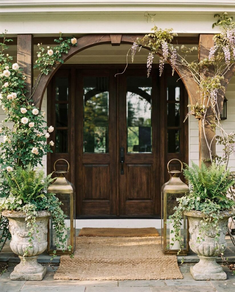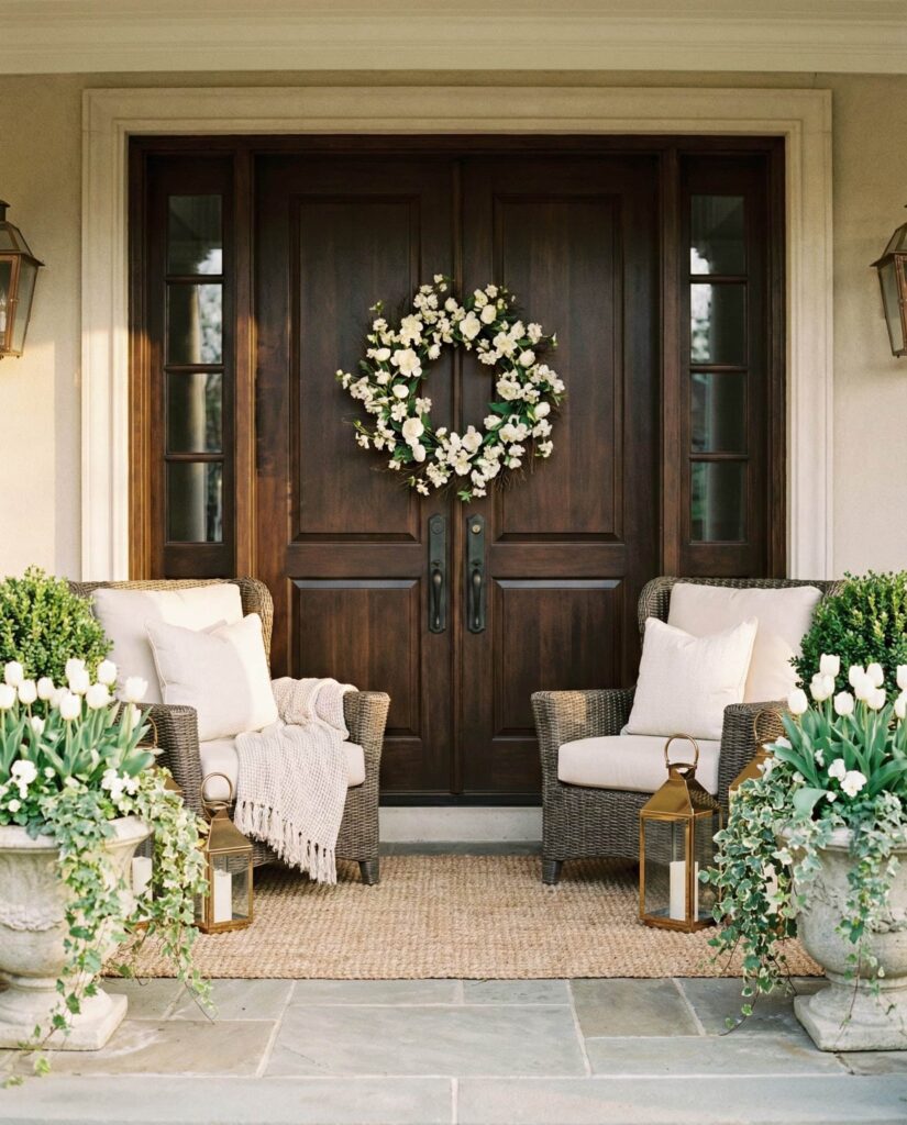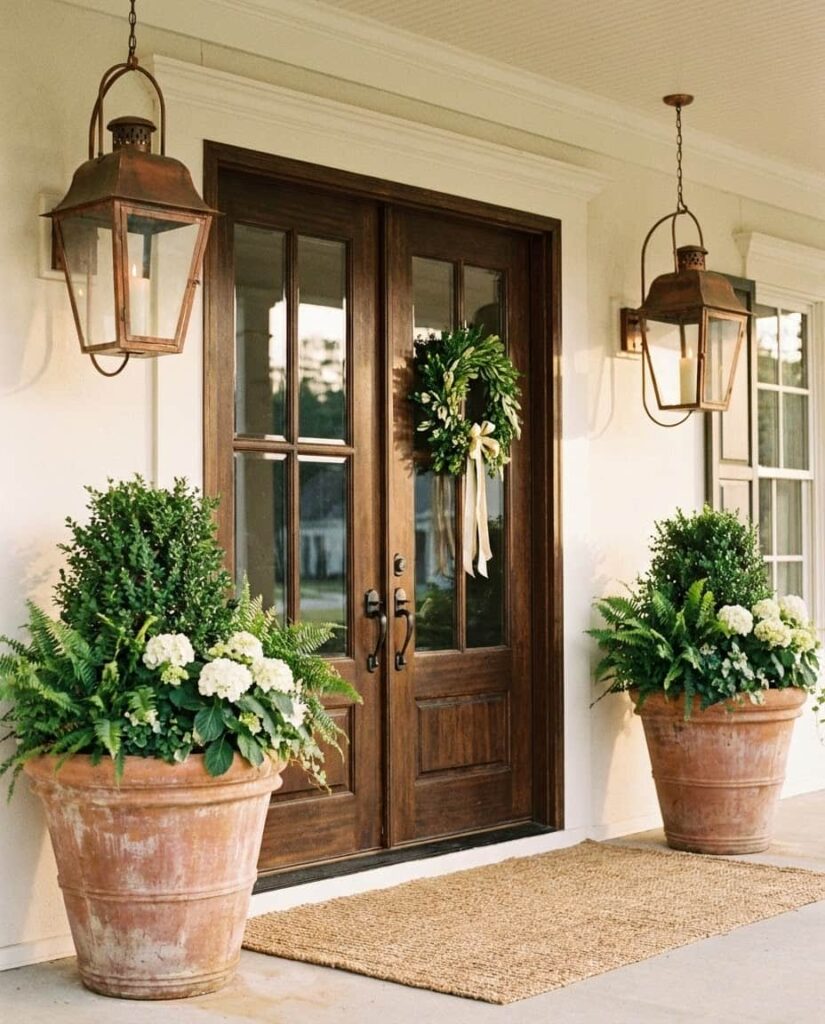 This Elegant porch idea draws from Vintage influences while emphasizing balance and symmetry, especially effective for homes with double doors. Matching planters, classic lanterns, and subtle greenery create Outdoor decorations that feel refined but not formal. The look transitions beautifully from late winter early spring, relying on structure rather than seasonal color. I’ve always noticed how symmetry brings calm to an entryway, making even modest homes feel polished. It’s a timeless approach that rewards restraint and thoughtful placement over excess.