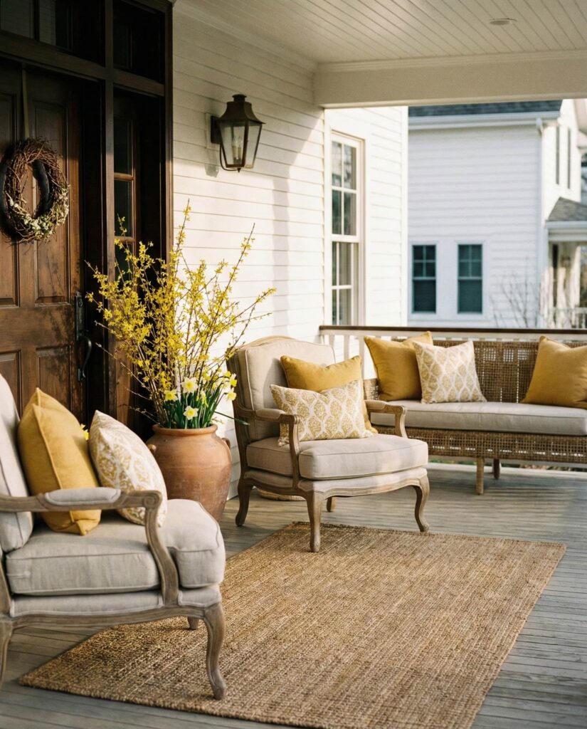 This Luxury idea centers on comfort-driven seating paired with minimal Outdoor decorations that hint at spring without overwhelming the space. Upholstered chairs, tailored cushions, and high-quality finishes elevate the porch while keeping it livable. Best suited for larger homes, this look feels curated rather than decorative. From what I’ve observed, homeowners who invest in comfort use their porches far more often, turning them into daily retreats instead of showpieces.