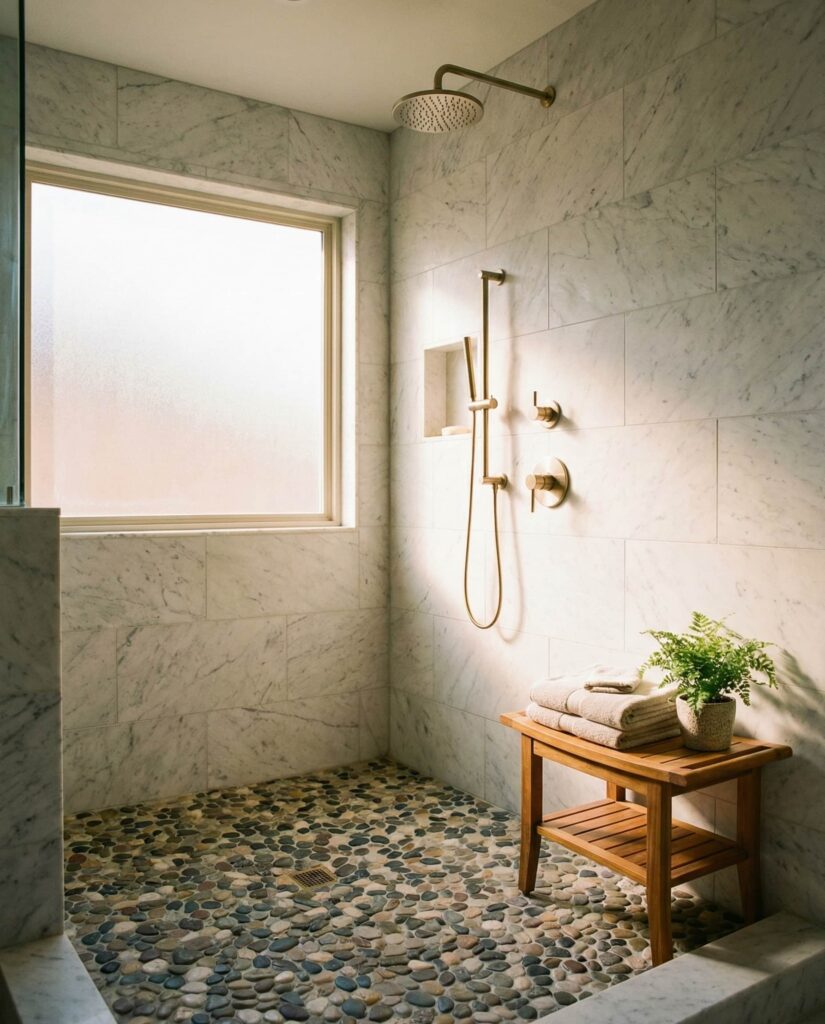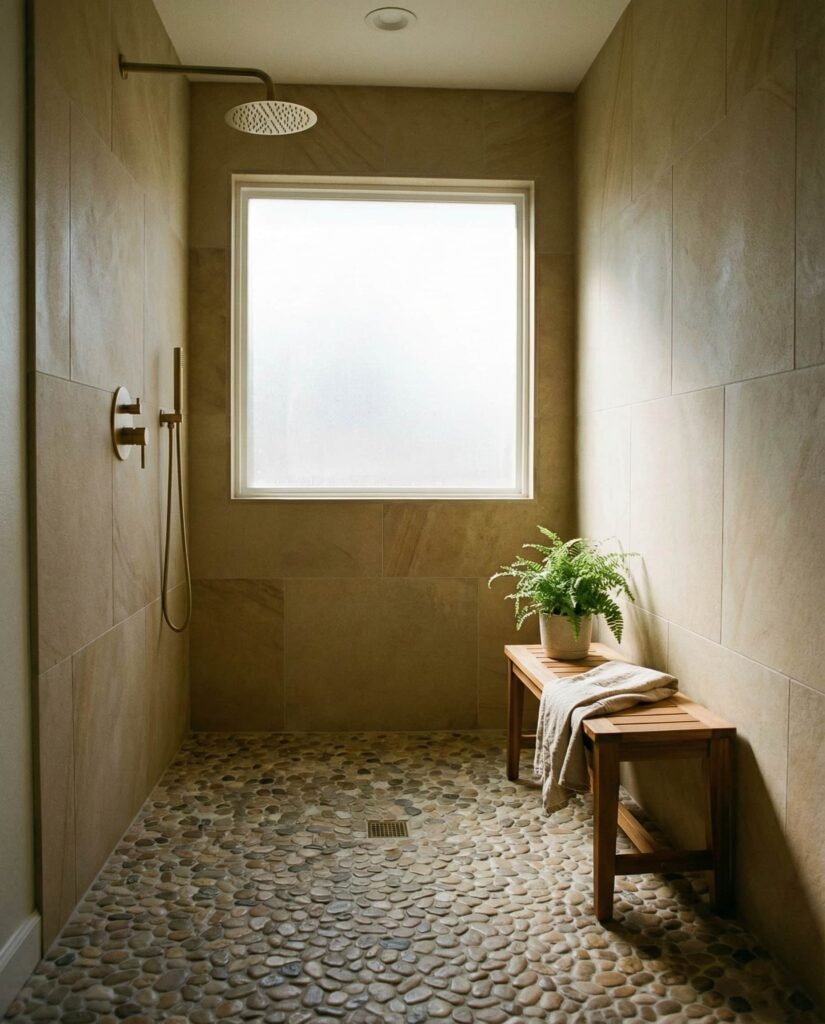 A spa-style walk-in shower emphasizing Tile ideas pebble floor textures is one of the most calming Ideas gaining traction. Pebble flooring adds sensory comfort and slip resistance, especially when paired with soft lighting and natural finishes. I’ve seen homeowners describe this as their favorite daily retreat. Balanced Dimensions, gentle Decor, and warm-toned walls ensure the pebbles feel intentional rather than decorative excess. The result is a walk-in shower that encourages slowing down and reconnecting with simple routines.