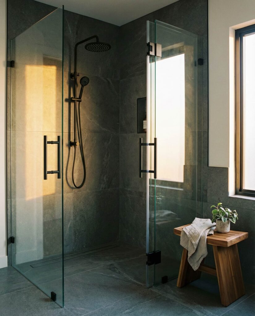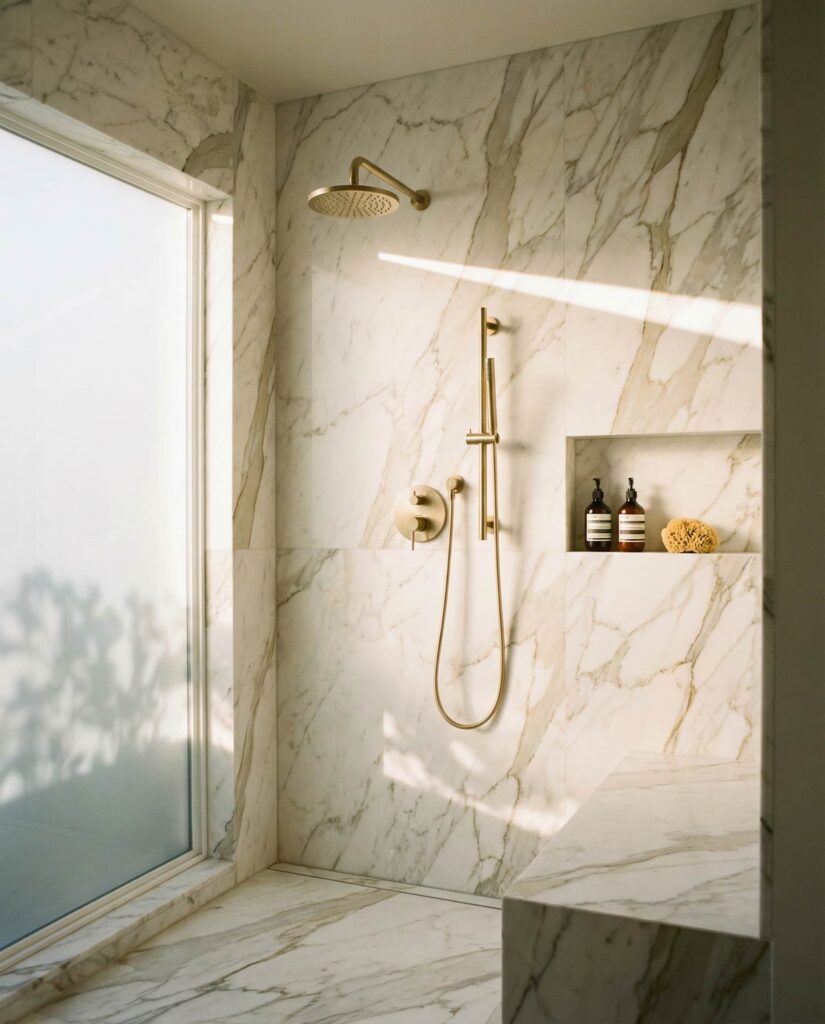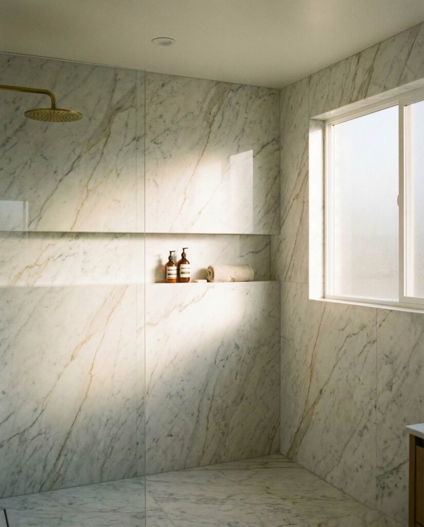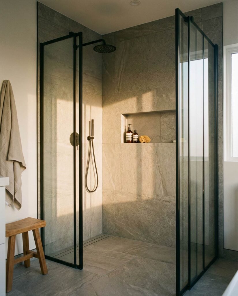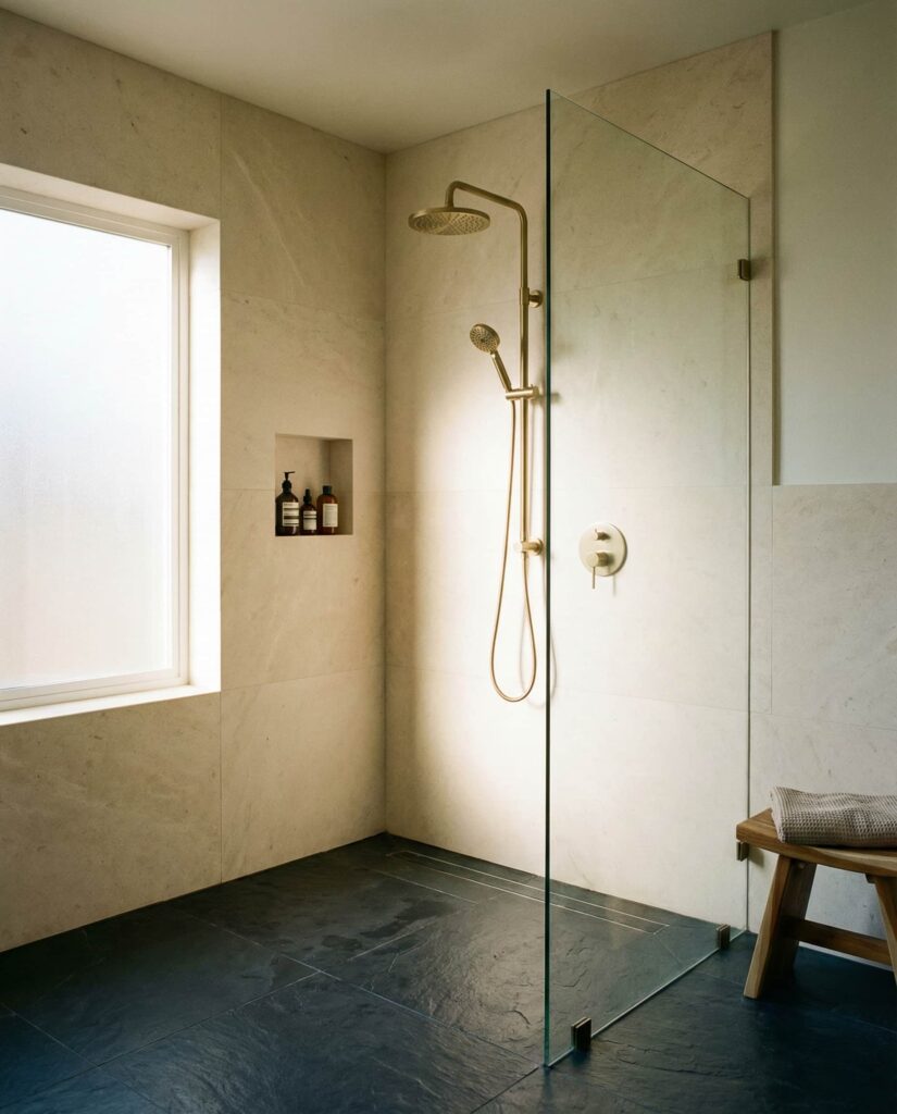 Using large-format Stone slabs is a walk-in shower Ideas trend focused on visual continuity. Fewer grout lines create a cleaner look and reduce maintenance, which homeowners increasingly value. Designers often pair stone walls with contrasting Floor ideas to ground the space. I’ve seen this solution appeal to people who want natural materials without a rustic feel. With thoughtful lighting and simple Decor, stone slab walk-in showers strike a balance between organic warmth and modern precision.