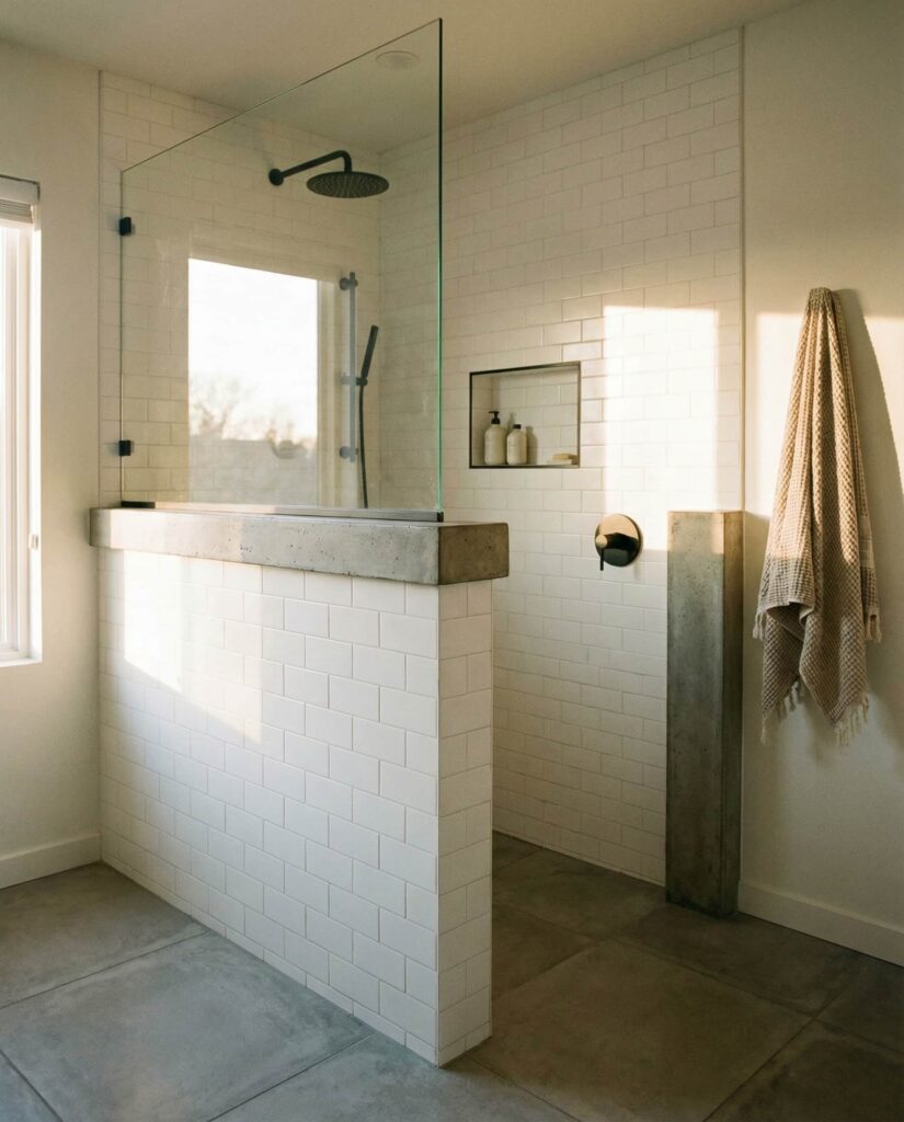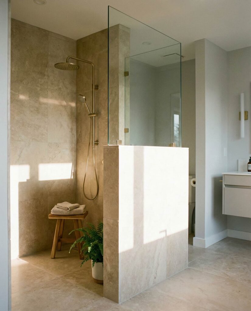 A walk-in shower using a Pony wall is one of the most adaptable Ideas for modern bathrooms. This partial wall creates privacy while allowing light and openness to flow above it. Designers often integrate storage niches or plumbing within the wall, maximizing function without clutter. I’ve seen this solution work especially well in Small bathroom layout floor plans master, where full walls would feel confining. When finished with cohesive Tile ideas color schemes and subtle Decor, the pony wall becomes a design feature rather than a compromise, offering structure and softness in equal measure.