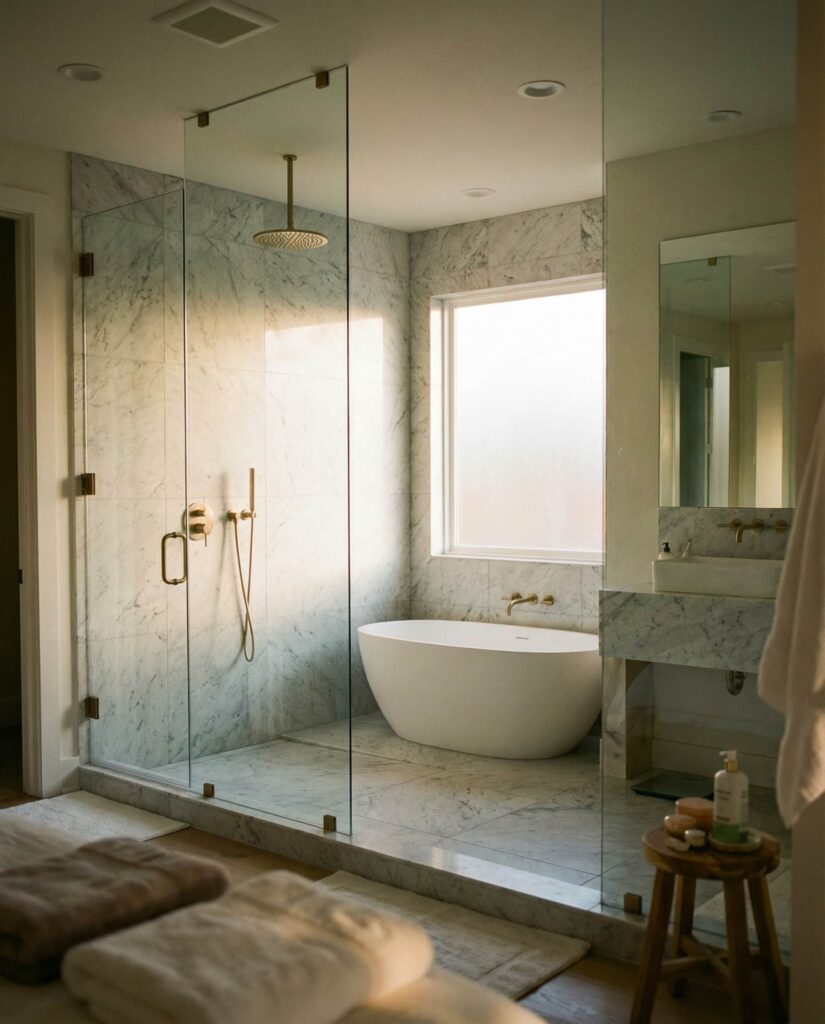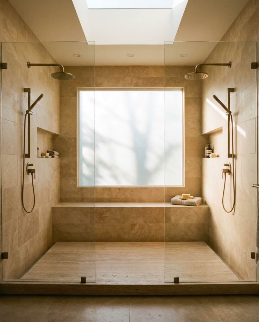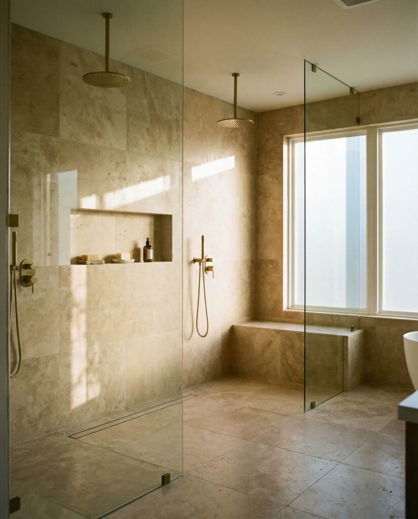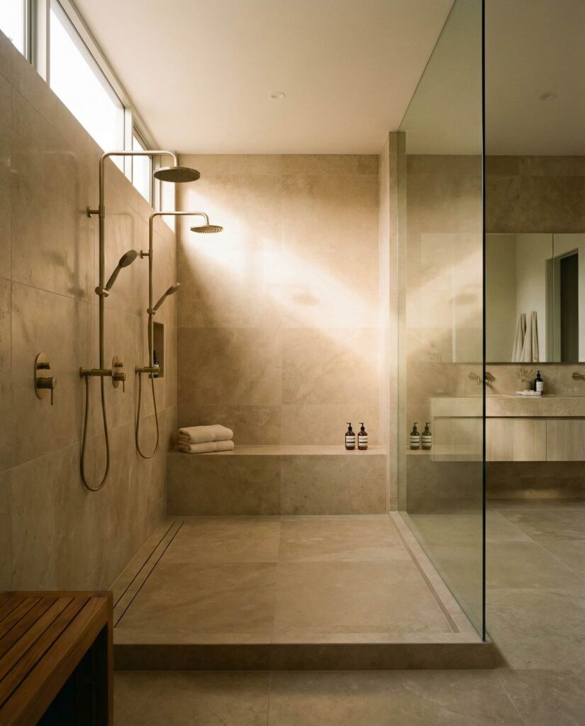 A walk-in shower with Double entry points is an emerging solution among spatially creative Ideas. This layout improves circulation in Large master bathrooms, allowing access from both the sleeping area and vanity zone. Proper Dimensions ensure water containment while preserving flow. I’ve noticed this design works best in homes where bathrooms are treated as open suites rather than closed rooms. Paired with cohesive Decor and well-planned Floor ideas, double-entry walk-in showers feel luxurious and intuitive rather than excessive.