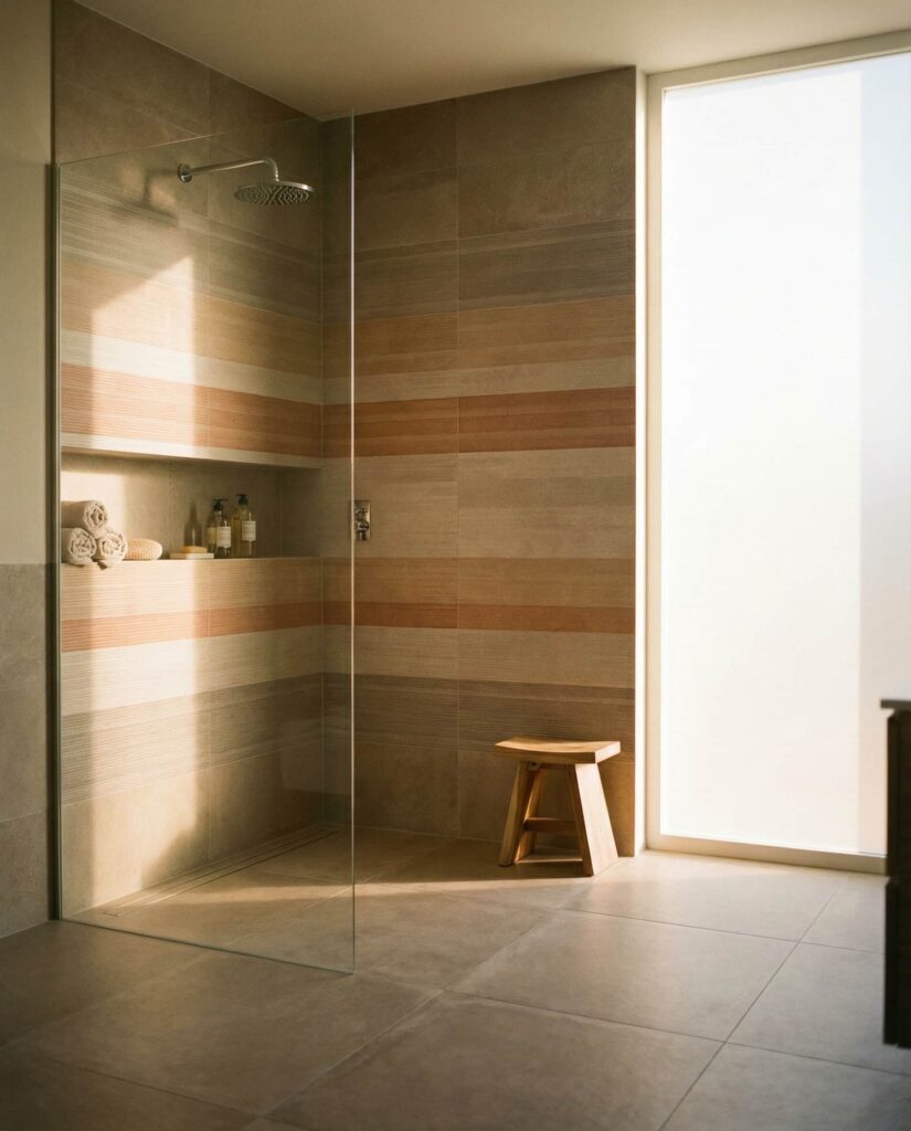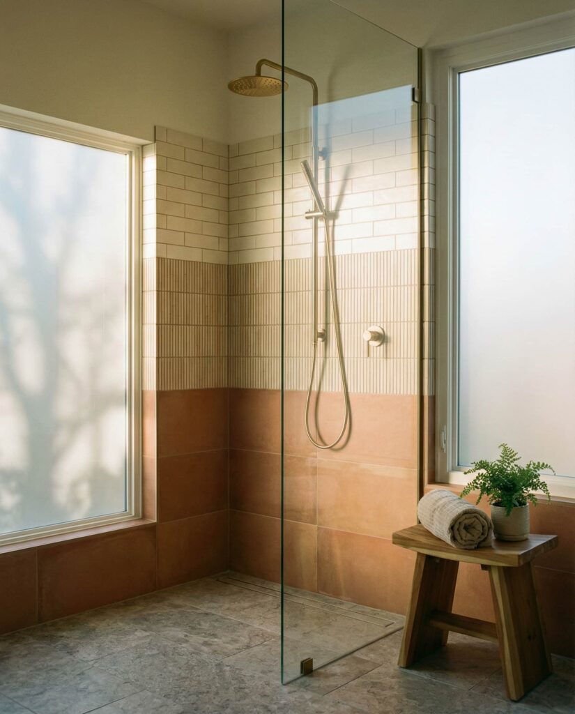 Layered Tile ideas color schemes are redefining expressive walk-in shower Ideas. Designers use tonal shifts or horizontal banding to add depth without visual clutter. This approach works across styles, from modern to transitional, and adapts well to varying Dimensions. I’ve noticed it’s especially popular among homeowners who want personality without bold patterns. Combined with simple fixtures and restrained Decor, layered tile color schemes make walk-in showers feel curated and intentional.