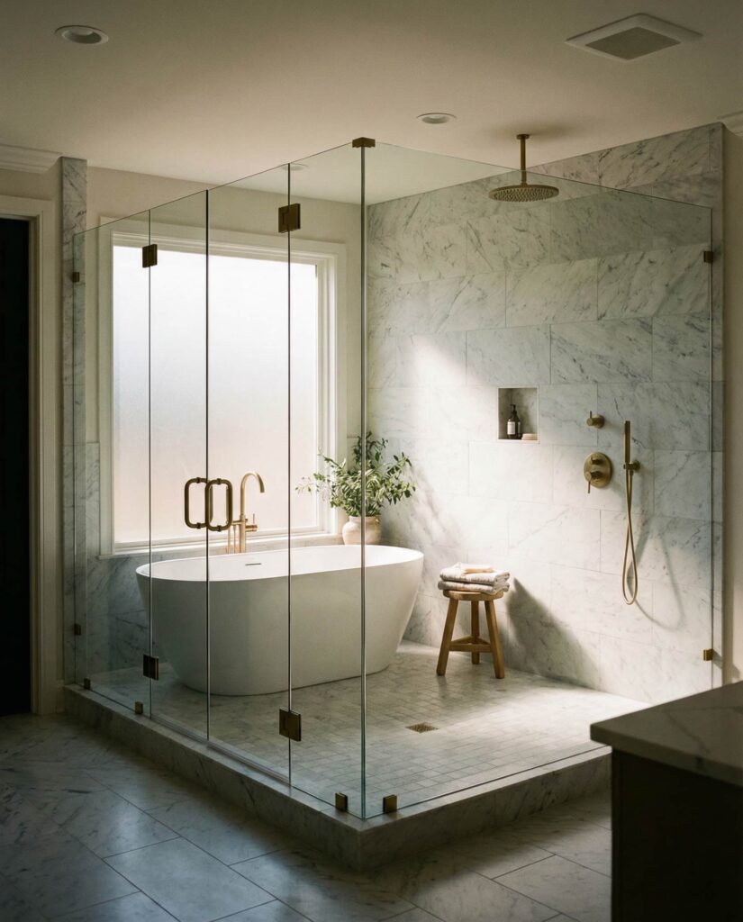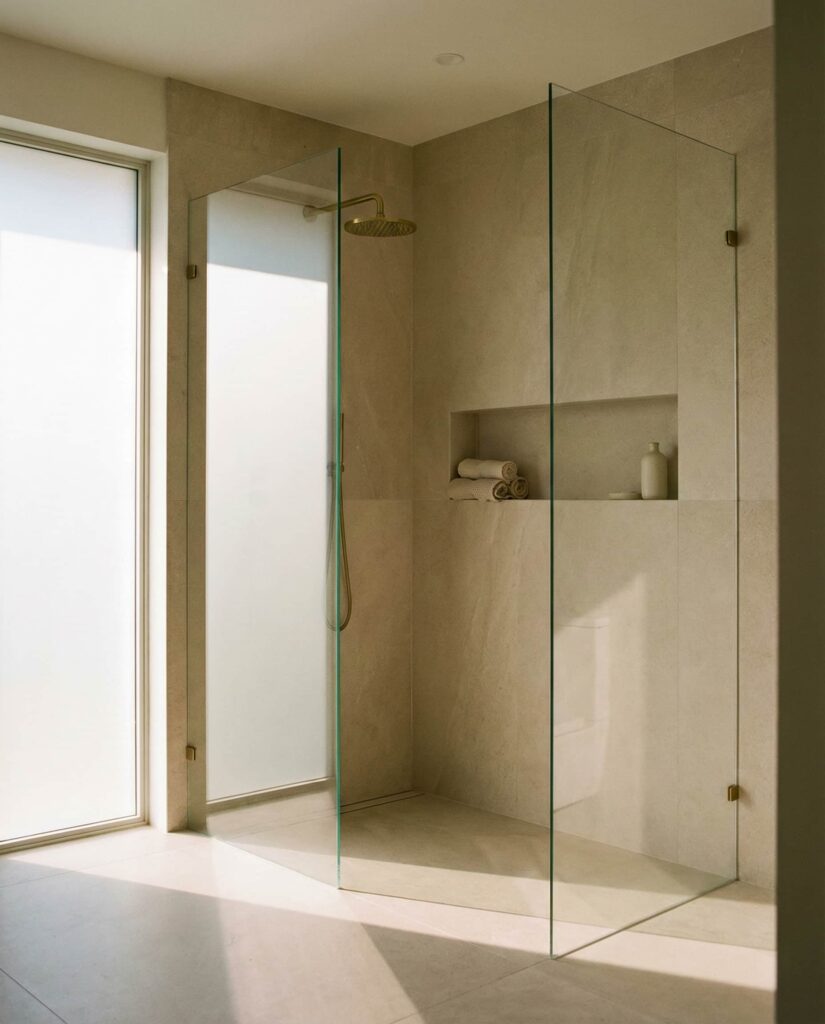 Minimalism continues to influence walk-in shower Ideas, particularly through barely-there Enclosures. Ultra-thin glass panels or partial screens define the wet area while preserving openness. I’ve noticed homeowners drawn to this style value calm visuals and long-term flexibility. When paired with neutral Tile ideas color schemes, soft Decor, and well-considered Dimensions, minimalist enclosure walk-in showers feel timeless rather than stark. This approach suits those who want clarity, light, and simplicity without sacrificing function.