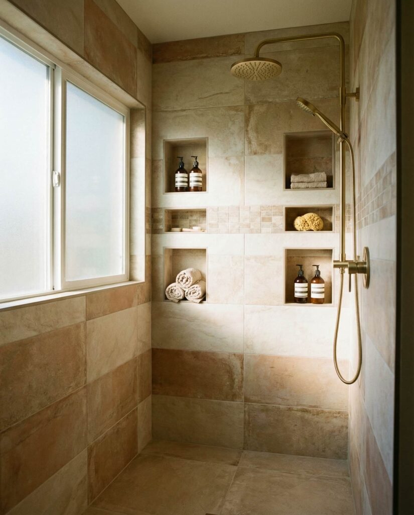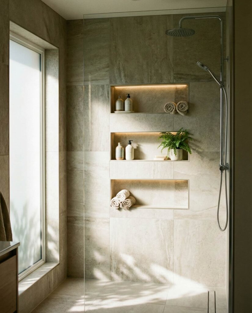 Smart storage has become central to modern Ideas, and walk-in showers are no exception. Integrated niches, recessed shelves, and built-in ledges allow everyday items to disappear into the design rather than cluttering it. In 2026, designers treat storage as part of Decor, aligning niches with grout lines and Tile ideas color schemes for a seamless look. I’ve noticed homeowners appreciate how this approach simplifies cleaning and daily routines. When planned with correct Dimensions, storage-enhanced walk-in showers feel intentional, balanced, and far more livable, especially in shared bathrooms where organization matters.