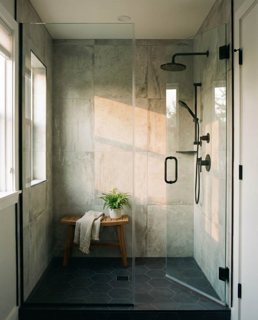 Among contemporary Ideas, walk-in showers with Black framed Enclosures stand out for their architectural clarity. This style borrows from industrial loft aesthetics but adapts easily to suburban homes. Thin black metal outlines define the shower zone without visually shrinking the room, making it suitable for both compact and Large master bathrooms. Careful Dimensions ensure the frame feels intentional, not heavy. Designers often pair this look with neutral Tile ideas color schemes and restrained Decor so the dark lines act as graphic accents. I’ve noticed homeowners choose this option when they want character and structure without committing to bold colors, achieving a look that feels current yet durable over time.