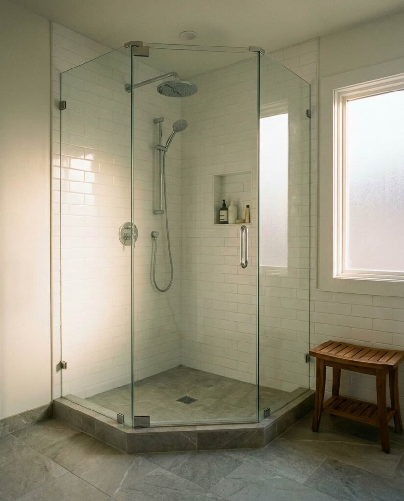 7. Corner Walk-In Shower with Smart Layout