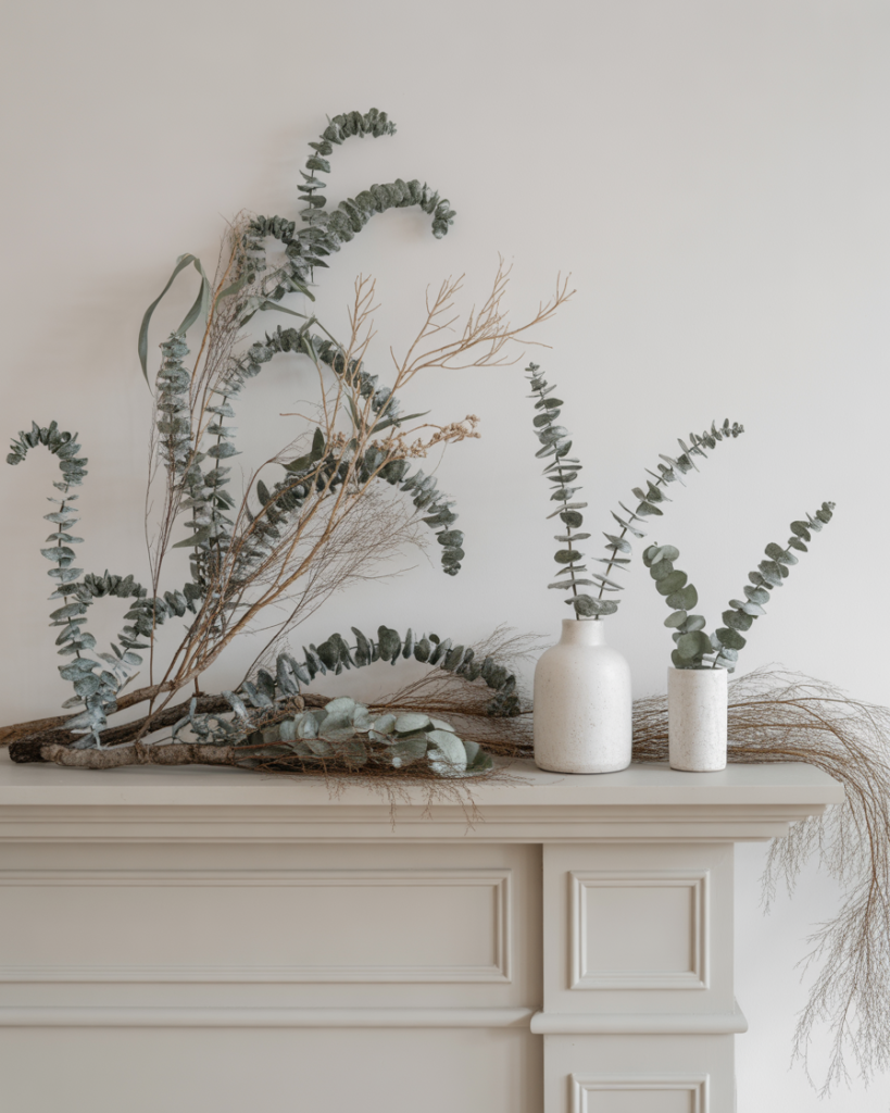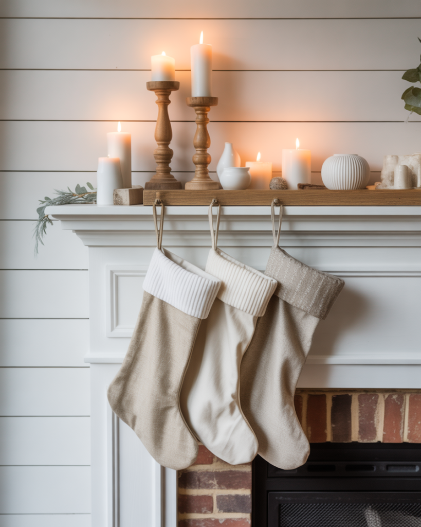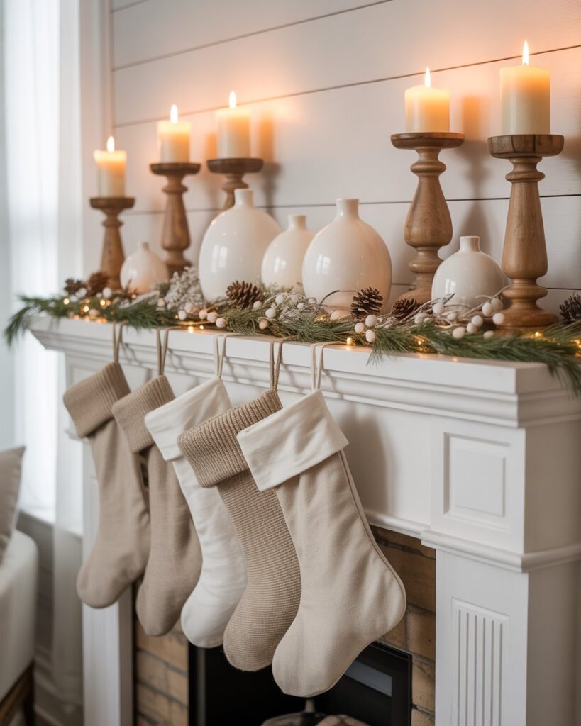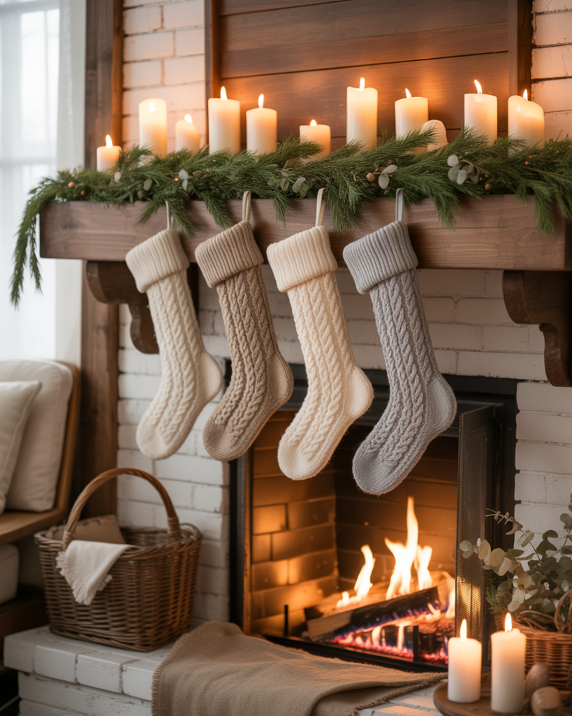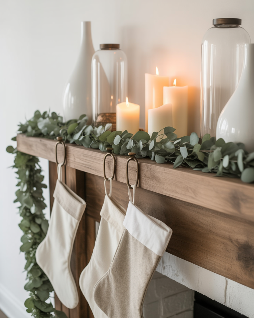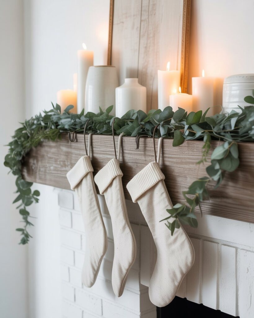 After the holidays fade, your Christmas fireplaces can feel overdone. Transition your decor with neutral, post Christmas ideas—swap red for beige, white, and simple natural elements. Eucalyptus, linen stockings, and candles in clear holders transform the space into a peaceful, modern farmhouse scene perfect for long January nights.