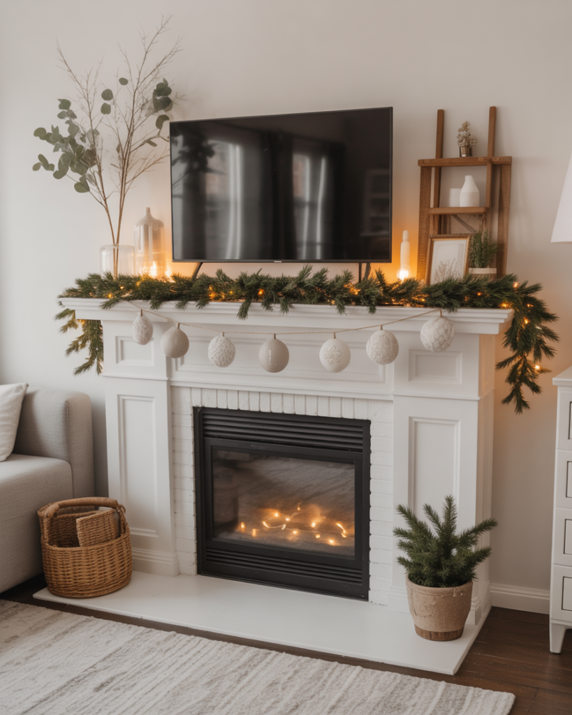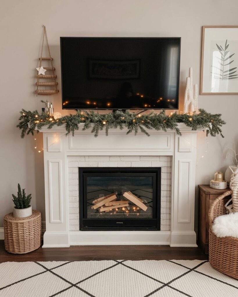 If your fireplace sits beneath a tv, balance technology with texture. Use neutral decor and Christmas with lights strands that wrap subtly around the screen area. Simple garlands, farmhouse diy crafts, and cozy textiles soften the lines and make even a modern space feel welcoming and bright through the winter season.