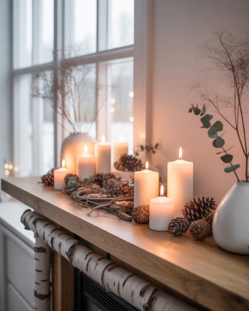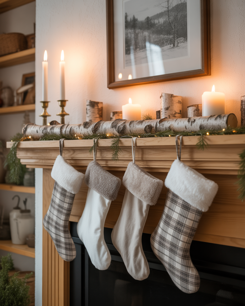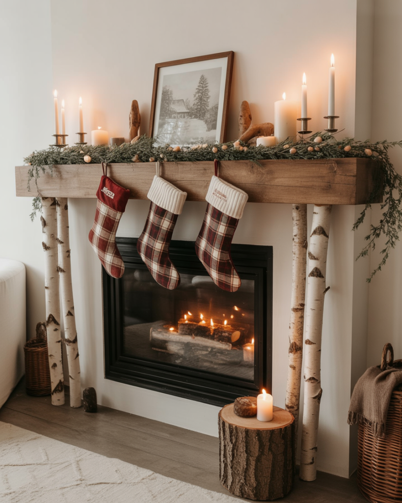Bring the wilderness home with farmhouse charm and Christmas fireplaces that feel like a cozy lodge. Use birch logs, plaid stockings, and candles arranged in rustic holders. This simple diy setup works beautifully for late winter evenings, creating a soft flickering glow that blends fall and Christmas moods into one timeless comfort.