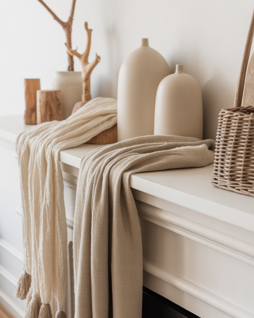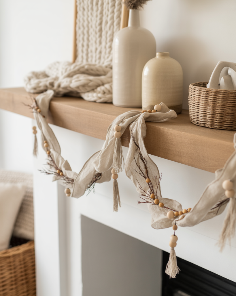 When bold red fades, lean into neutral textures for your post Christmas decor. Layer linen garlands, cream vases, and wood accents for a minimalist but warm composition. These Christmas mantel ideas transition naturally into January, making the fireplace feel light, inviting, and perfect for small spaces or open-concept homes.