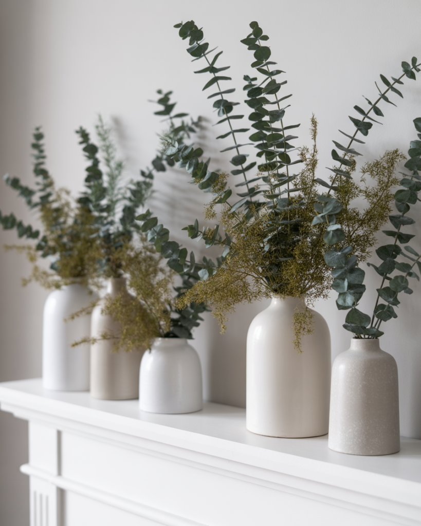 Add life to your Christmas fireplaces with winter greenery—ferns, dried branches, and soft eucalyptus. Ideas diy like placing them in white ceramic vases keep the look simple yet elegant. The mix of modern minimalism and organic materials adds freshness that feels just right for January’s calm energy.