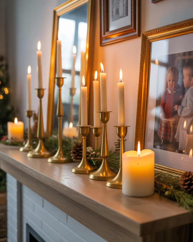 Warm up your Christmas mantel ideas by incorporating subtle metallics. A few golden candlesticks and brass picture frames can transform your fireplace into a glamorous yet cozy scene. These ideas work in both modern and farmhouse interiors, adding just enough shine for those post Christmas evenings.