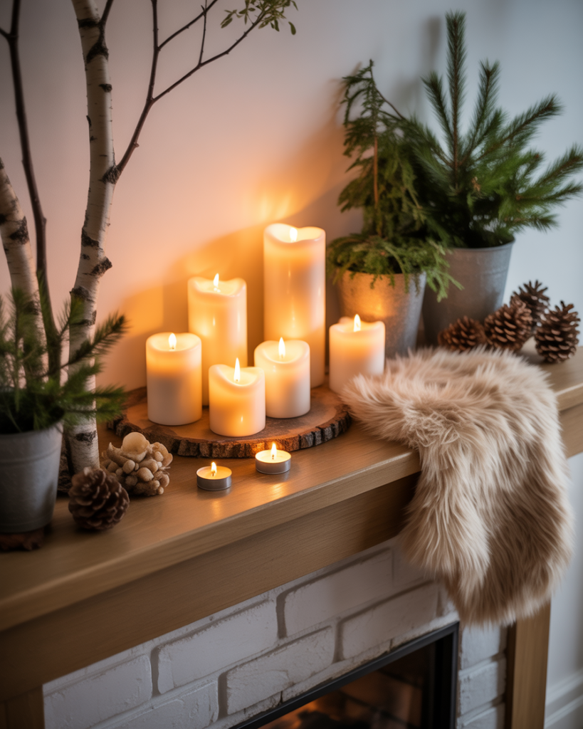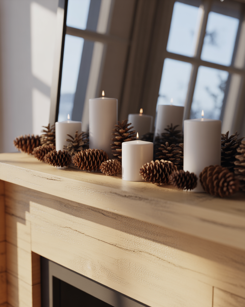 Embrace hygge with Scandinavian Christmas simple style. Choose white candles, pinecones, and unfinished wood to create calm, minimalist harmony. The fireplace becomes a space for reflection and comfort, perfect for January mornings with hot cocoa and blankets.